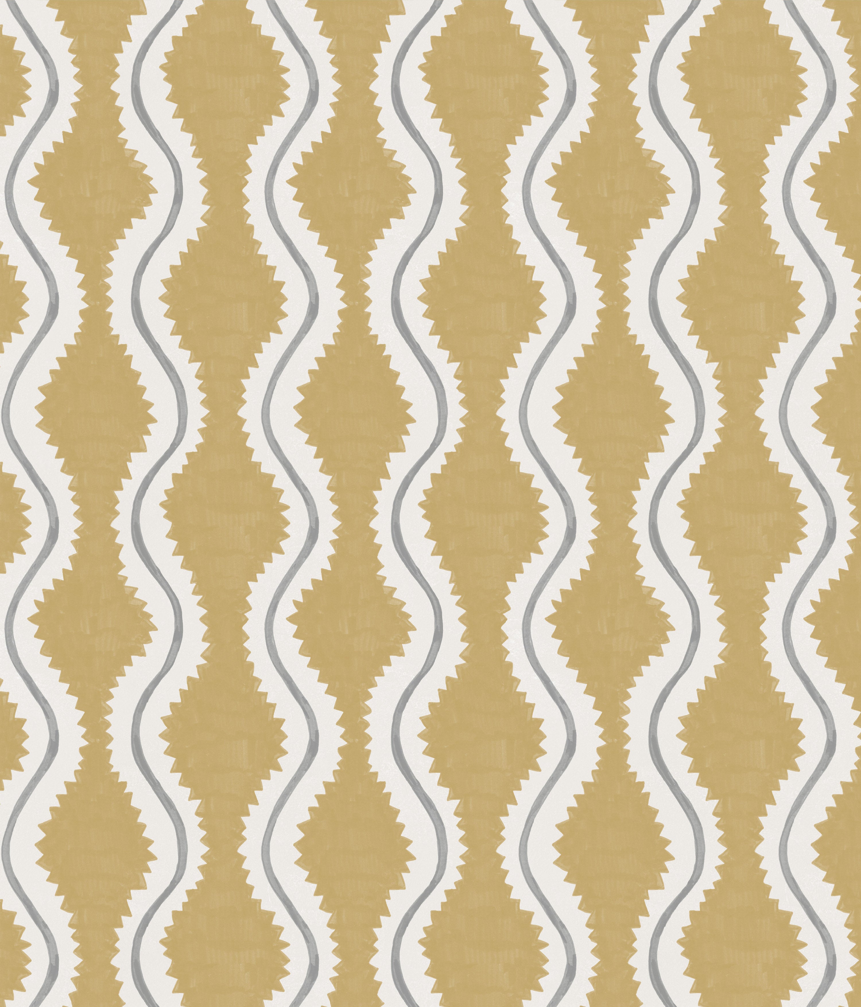 Detail of wallpaper in a playful curvy stripe print in white and gray on a mustard field.