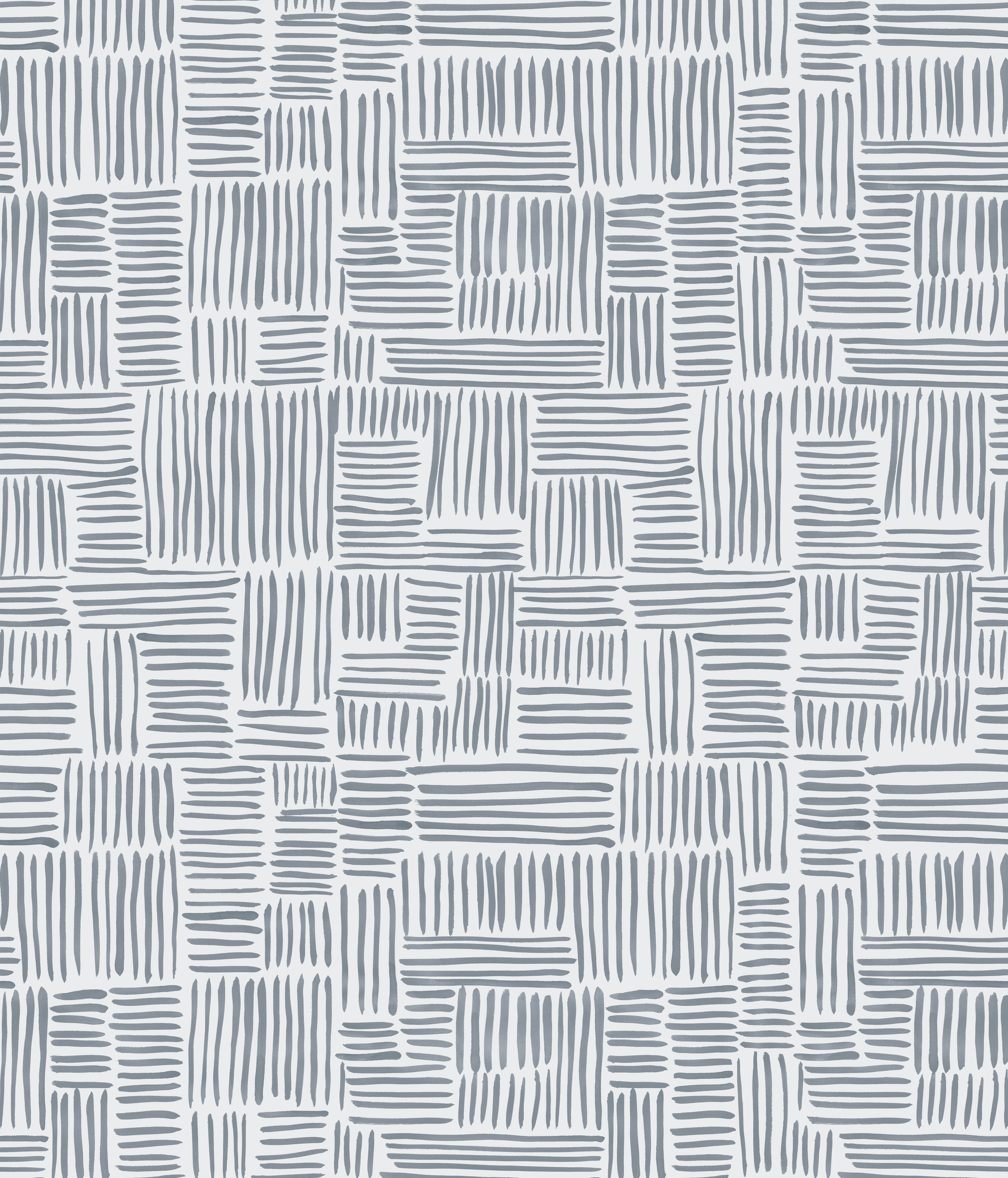Detail of wallpaper in a directional dash pattern in blue-gray on a white field.