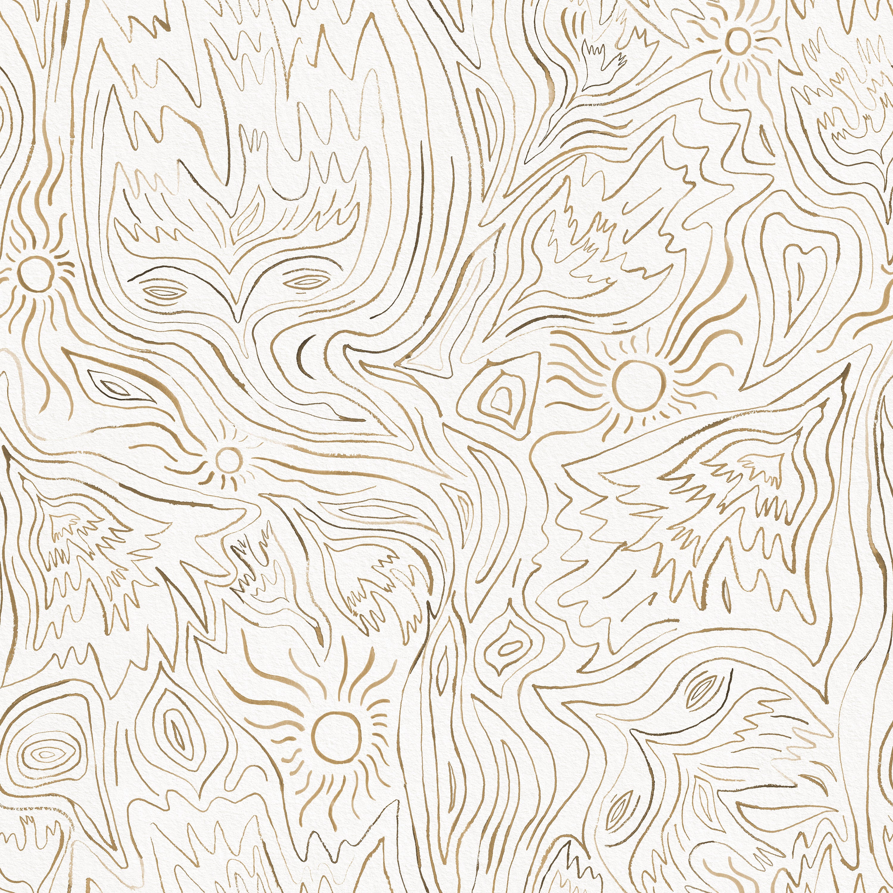 Detail of wallpaper in a playful abstract sun print in brown on a cream field.