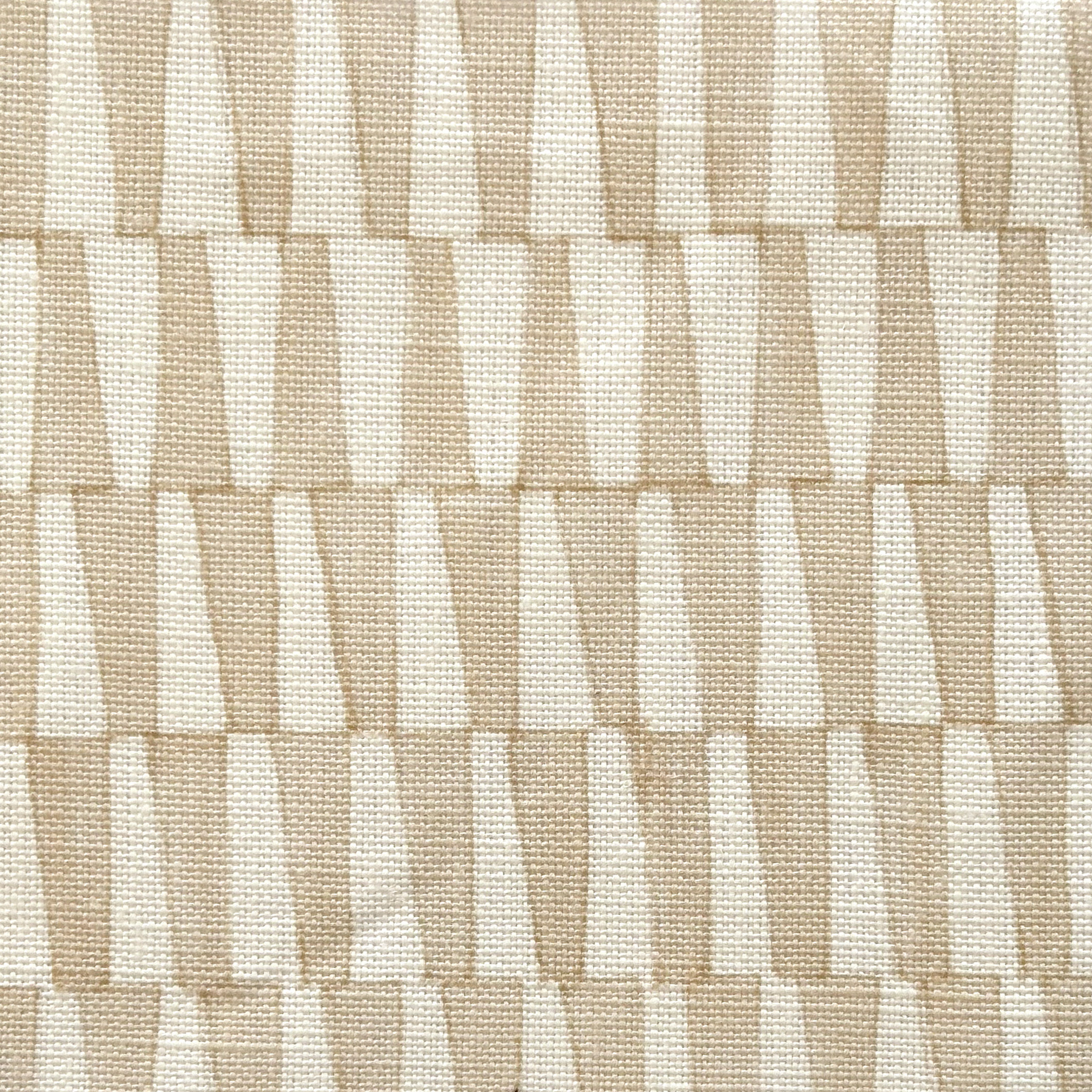 Detail of fabric in a playful triangular stripe print in white and light brown.