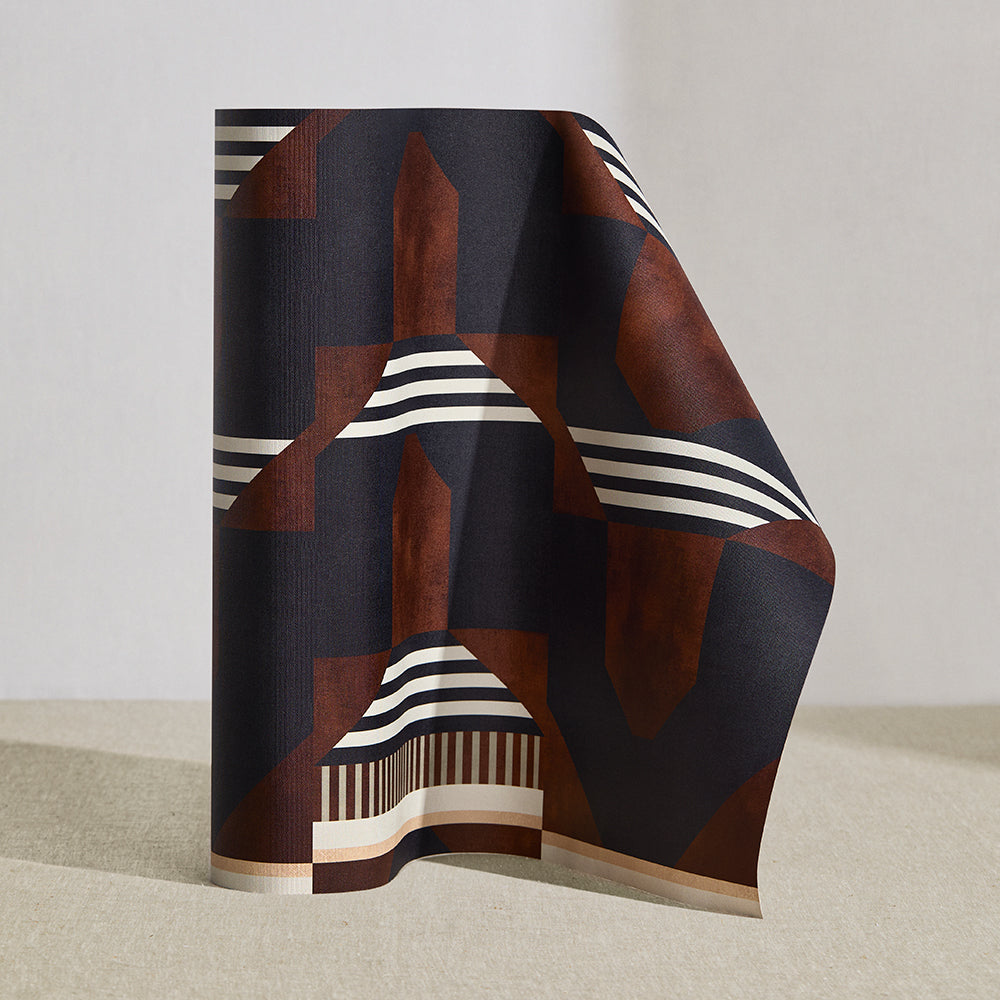 Wallpaper roll in a graphic geometric design in burn siena, black, taupe and cream.