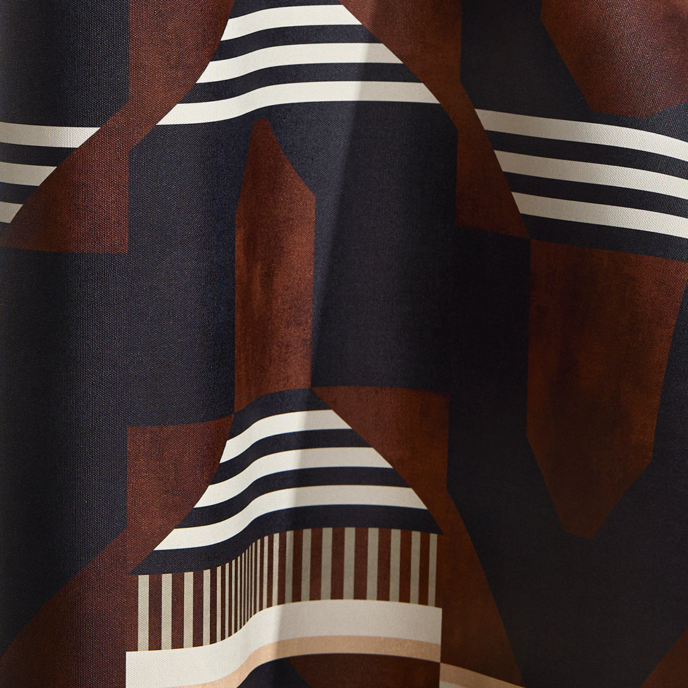 Graphic geometric design in burn siena, black, taupe and cream.