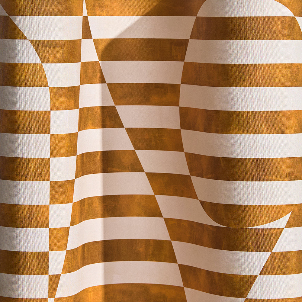 Trompe l'oeil stripe pattern with geometric shapes in cream and ochre.