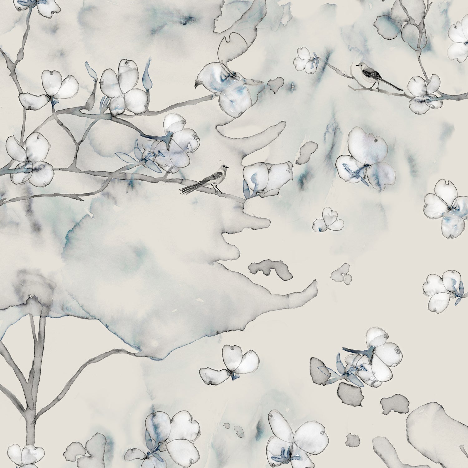 Wallpaper detail in a watercolor branch and floral pattern in grey and blue on a taupe muted taupe field.
