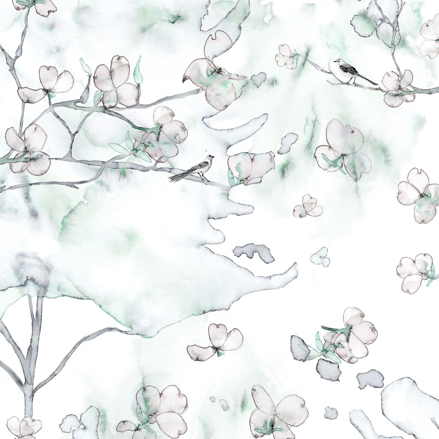 Wallpaper detail in a watercolor branch and floral pattern in teal green on a white field.