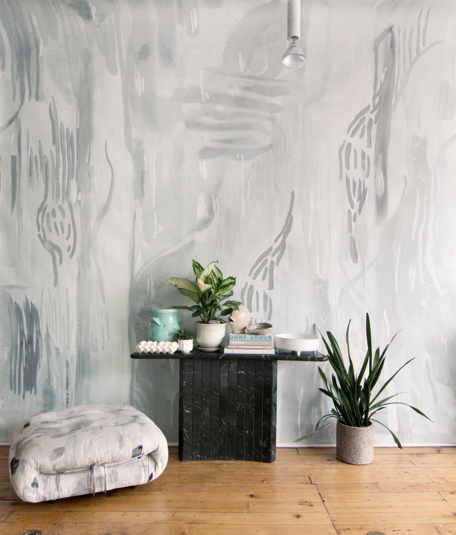 Living rooms scene with pedestal table, ottoman and plants against a watercolor wallpaper mural in shades of grey.