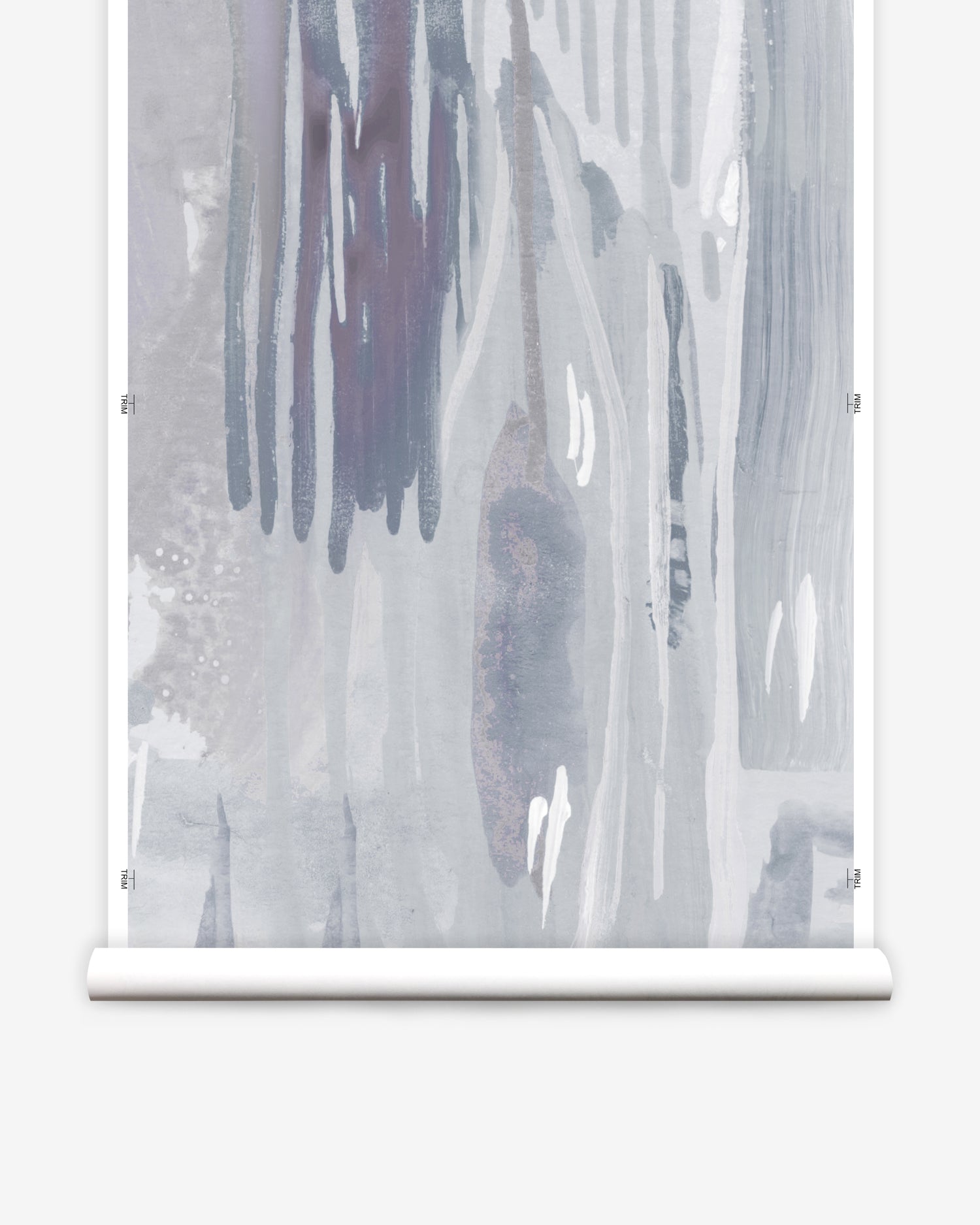 Wallpaper mural roll in a watercolor paint print in shades of purple and gray on a cream field.