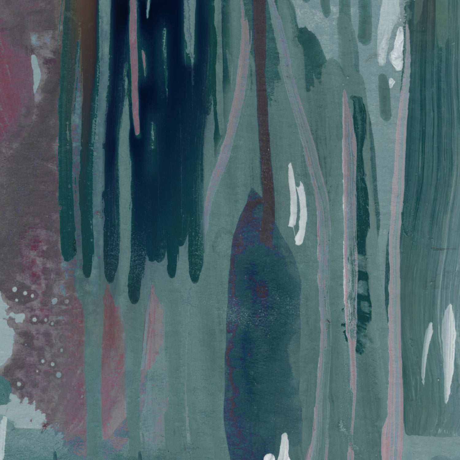 Wallpaper mural detail in a watercolor paint print in shades of pink, purple and turquoise on a blue field.