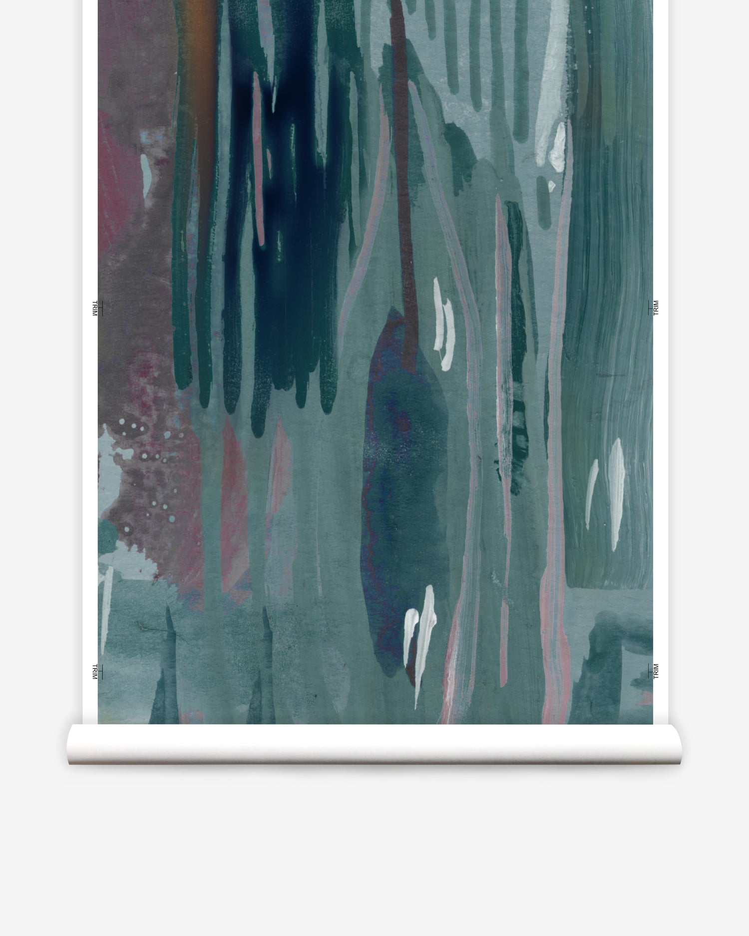 Wallpaper mural roll in a watercolor paint print in shades of pink, purple and turquoise on a blue field.