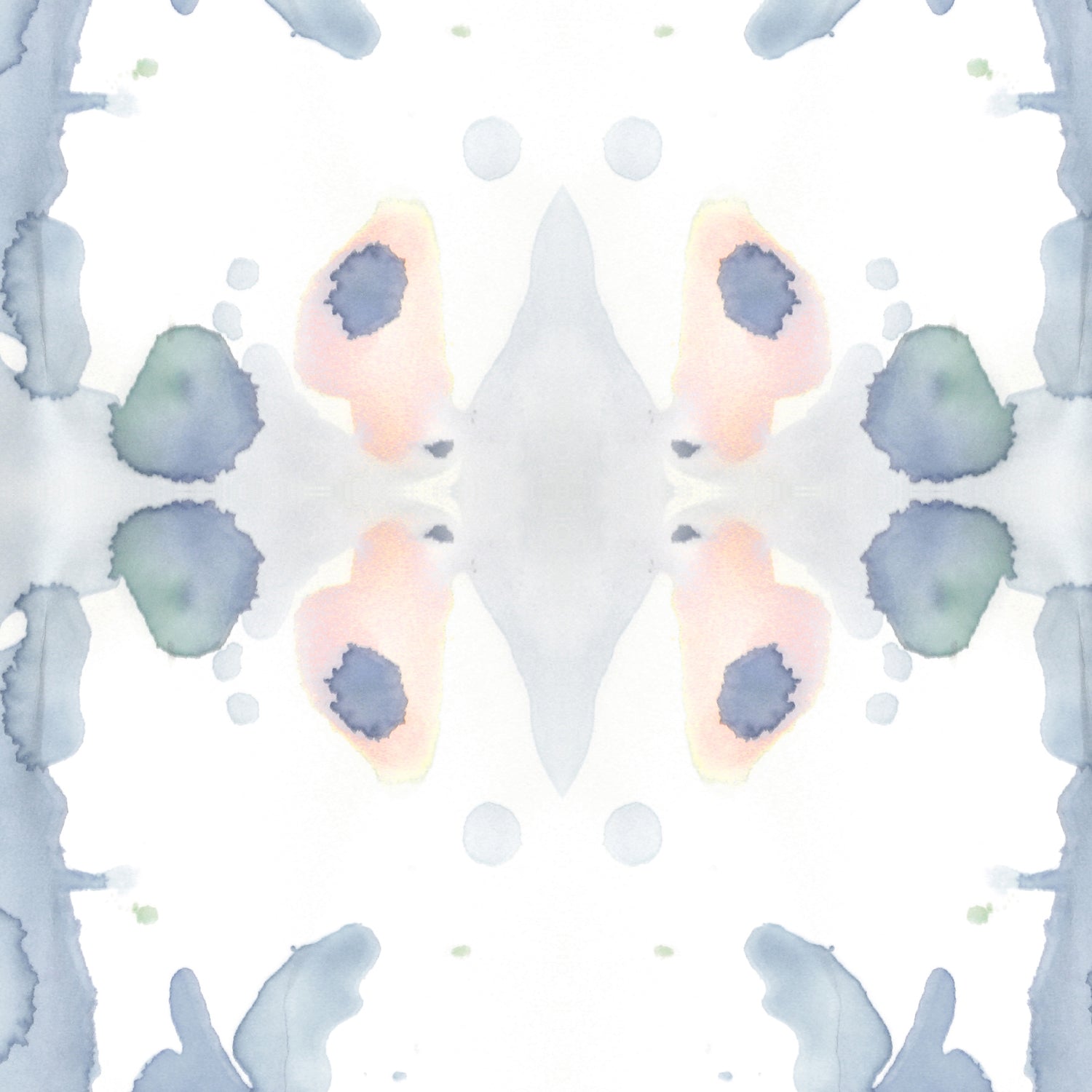 Wallpaper detail in a watercolor ink splash print in shades of pastel blue and pink on a cream field.