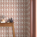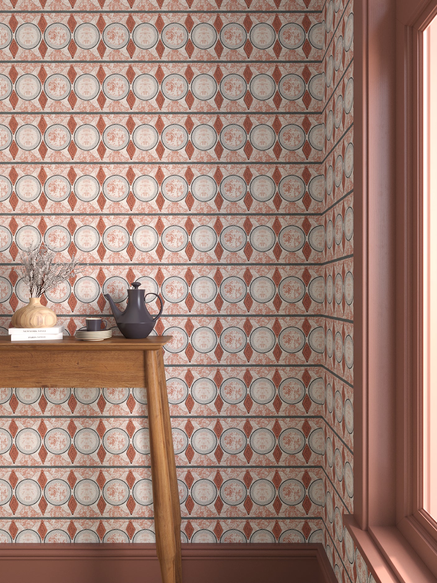 Detail of wallpaper in an intricate geometric stripe in shades of rust, gray and cream.