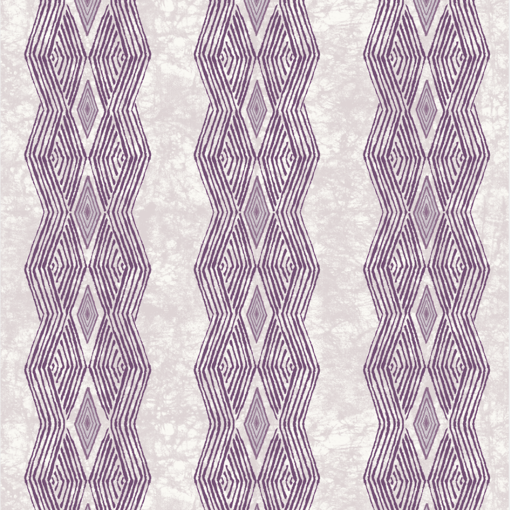 Detail of wallpaper in an intricate diamond stripe print in purple on a cream field.