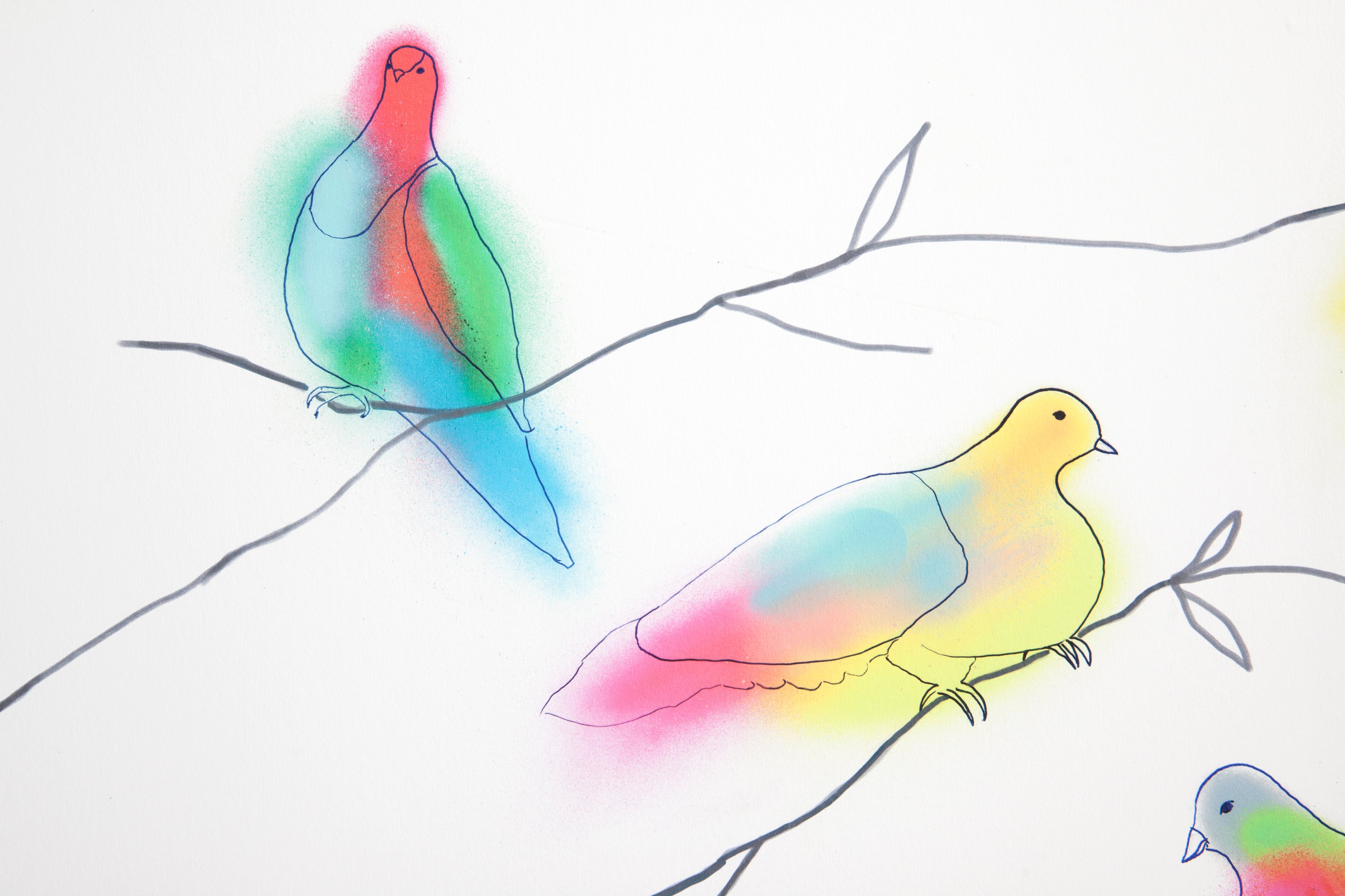 Wallpaper panels in a painterly bird and branch print in green, yellow, pink and black on a white field.