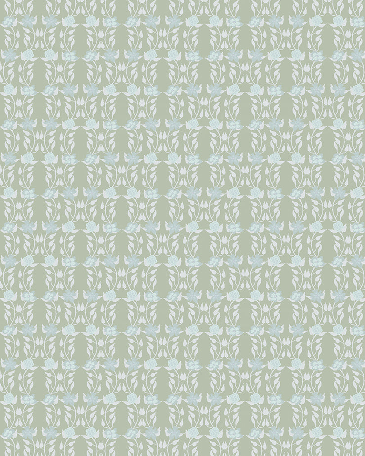 Detail of wallpaper in a linear floral print in blue and white on a green field.