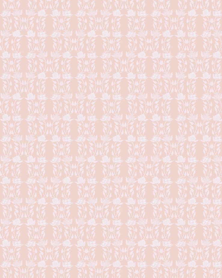 Wallpaper in a linear floral print in white and cream on a light pink field.