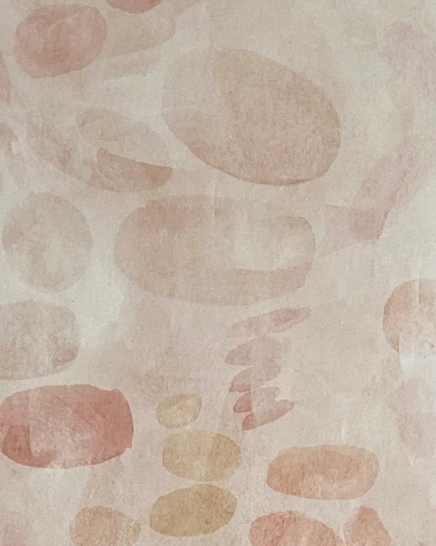 Detail of wallpaper in a playful paint blotch print in shades of light pink on a cream field.