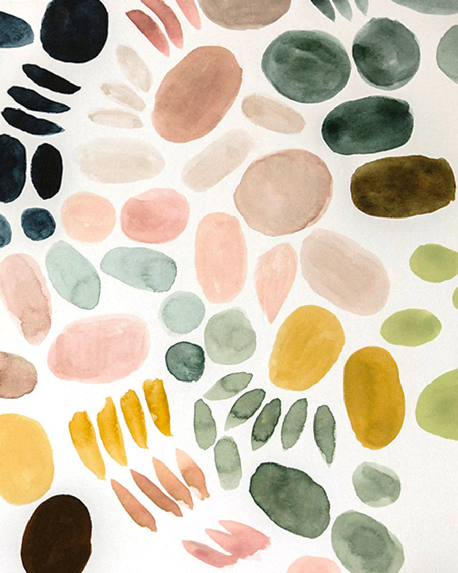 Detail of wallpaper in a playful paint blotch print in shades of green, pink and yellow on a white field.