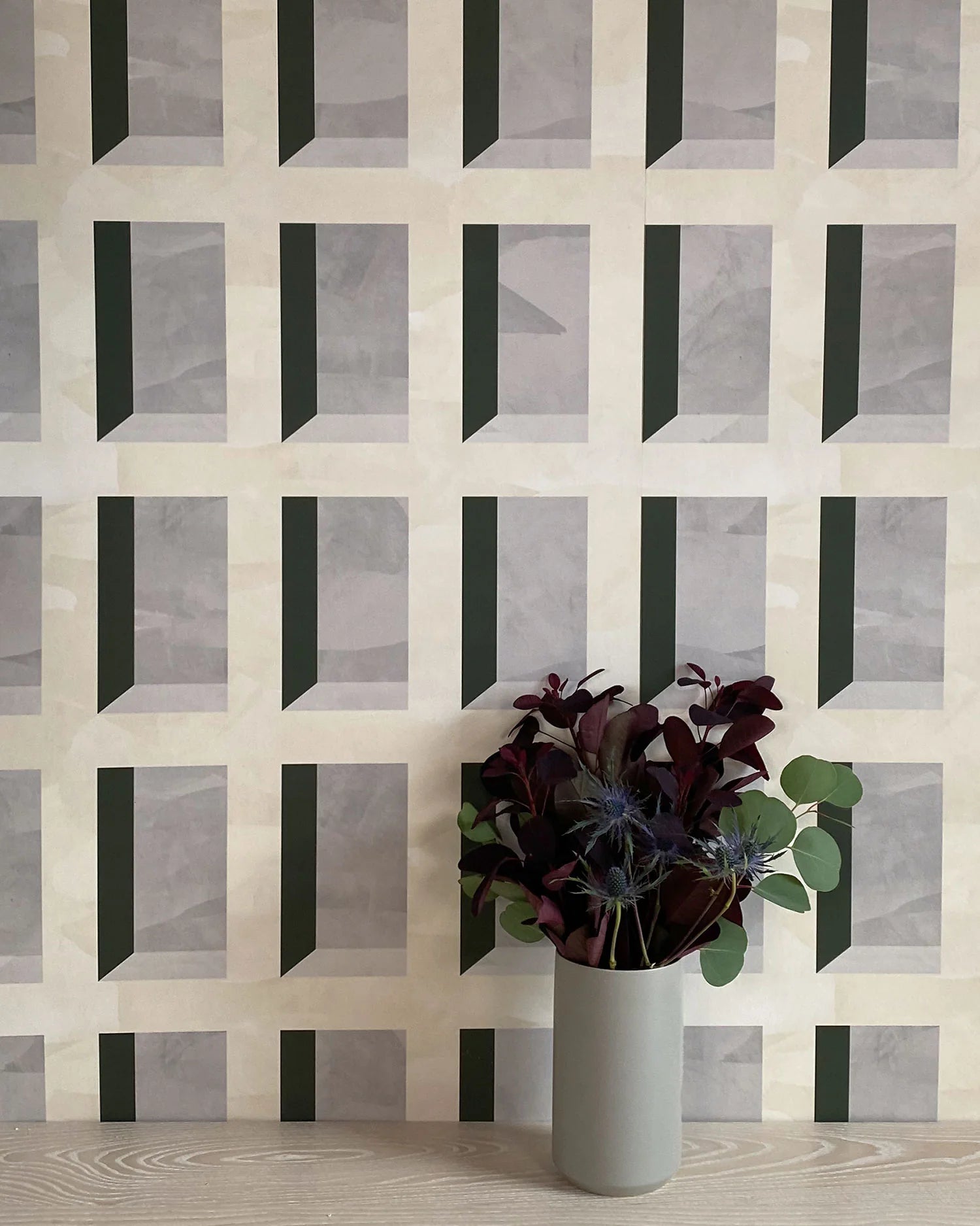 A vase of flowers stands in front of a wall papered in a dimensional grid print in shades of cream, gray and charcoal.