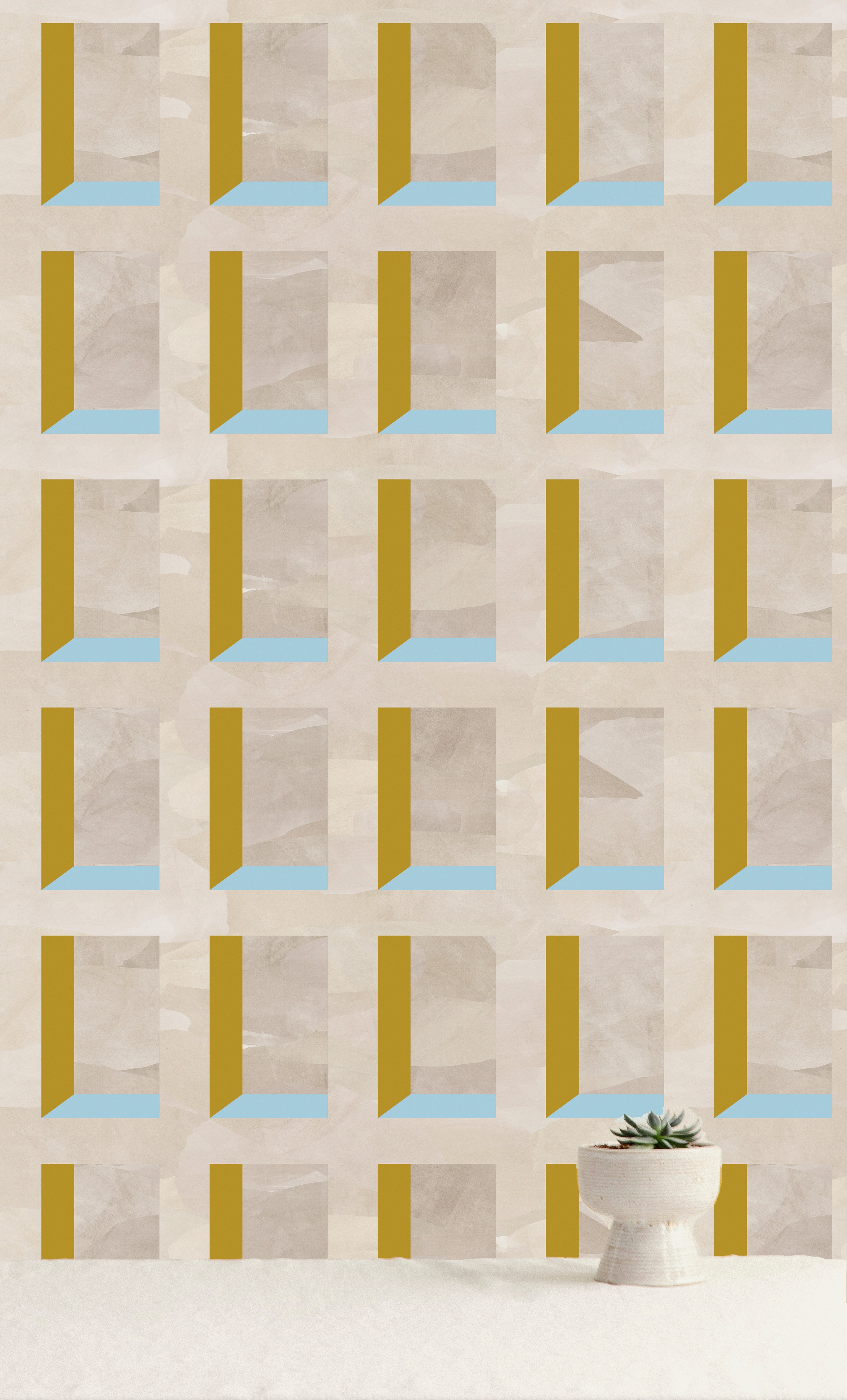 A potted cactus stands in front of a wall papered in a dimensional grid print in shades of cream, light blue and yellow.