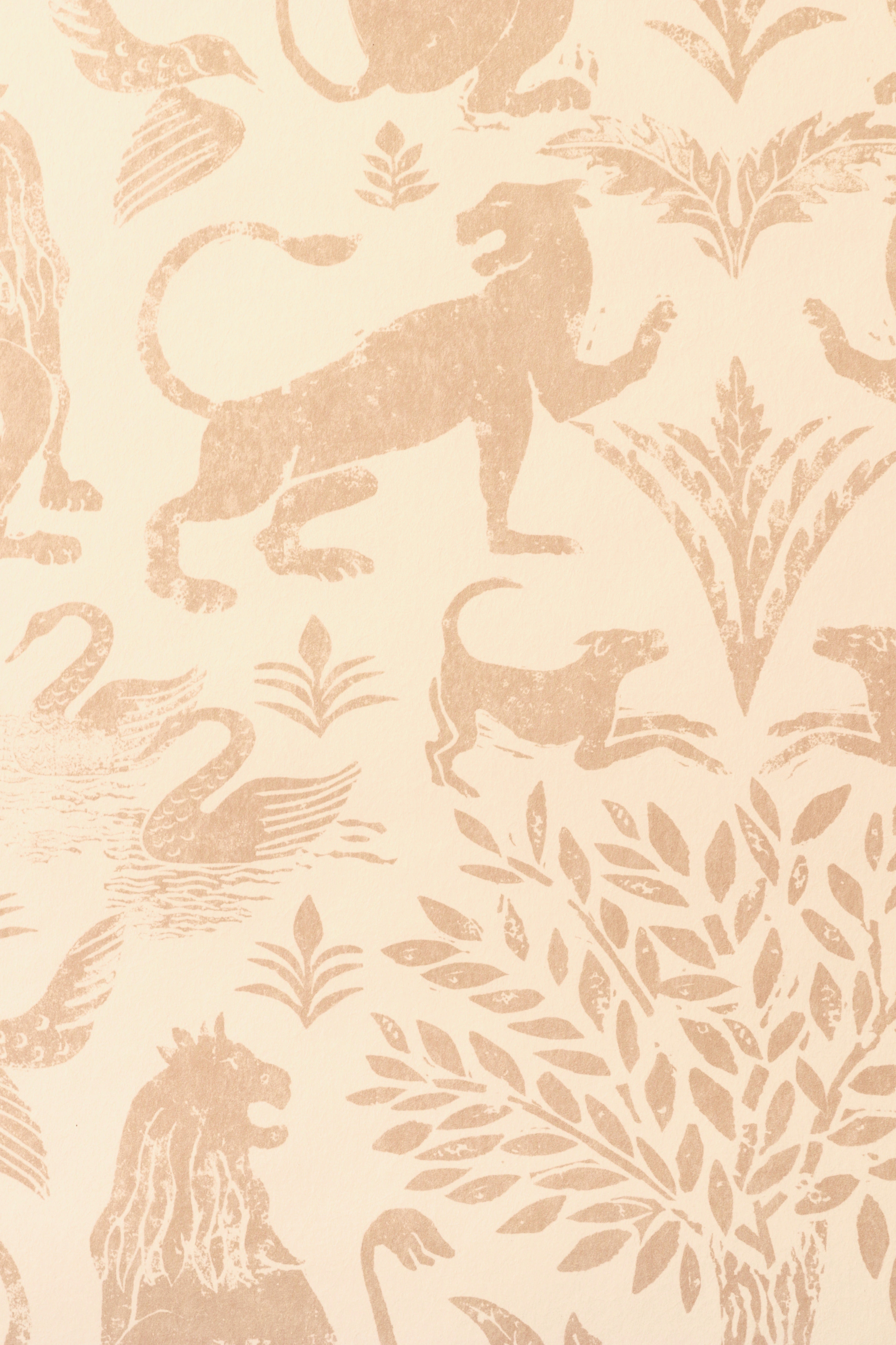 Detail of wallpaper in a lion and plant print in light pink on a white field.
