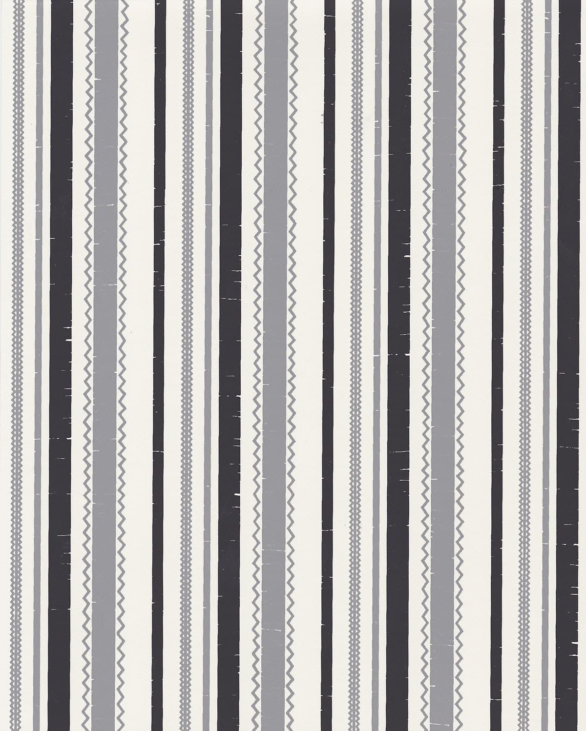Detail of wallpaper in a playful ticking stripe print in shades of gray and charcoal on a cream field.