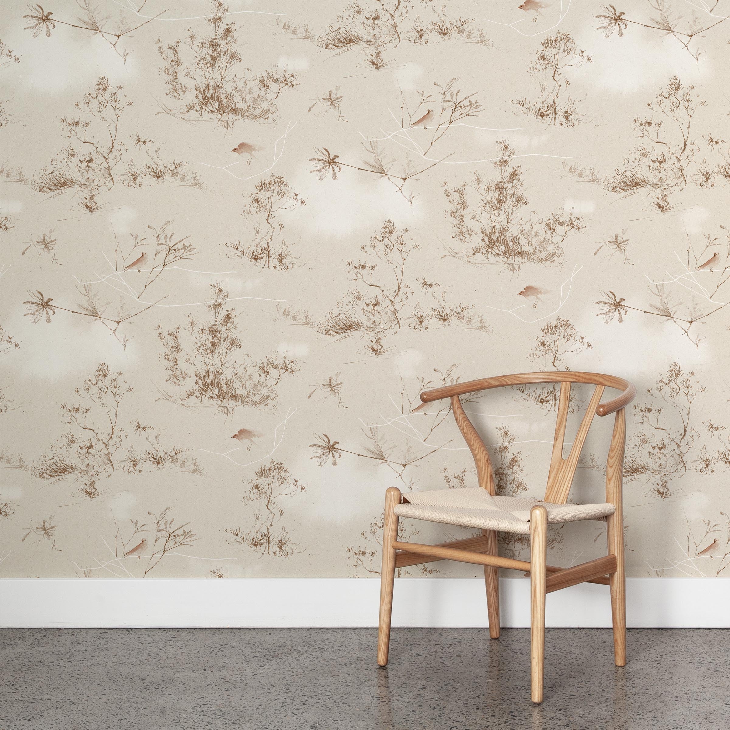 A wooden chair stands in front of a wall papered in a painterly bird and branch print in shades of brown, white and cream.