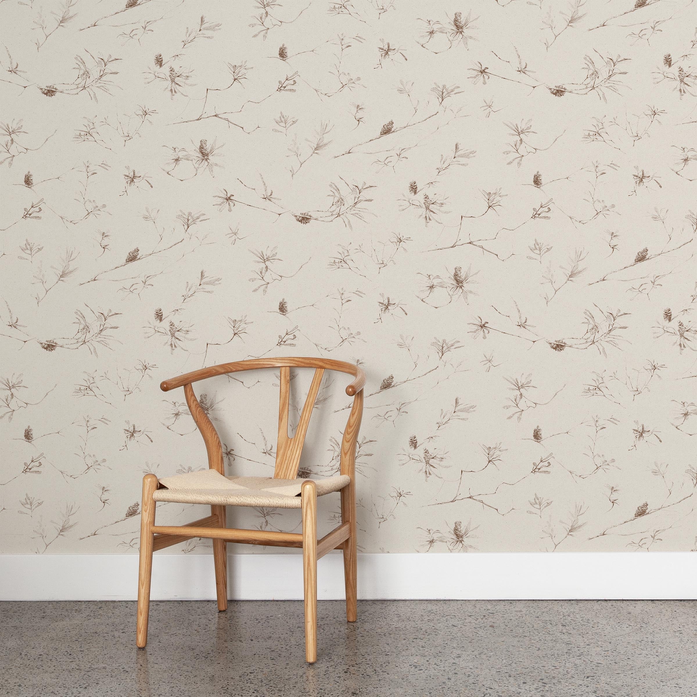 A wooden chair stands in front of a wall papered in a painterly pine cone and branch print in brown on a cream field.