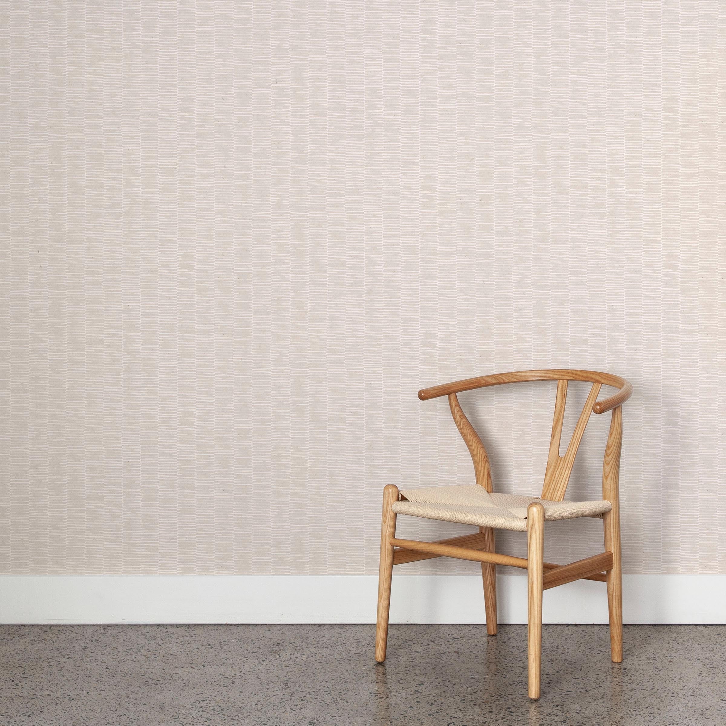 A wooden chair stands in front of a wall papered in a small-scale checked pattern in shades of cream.