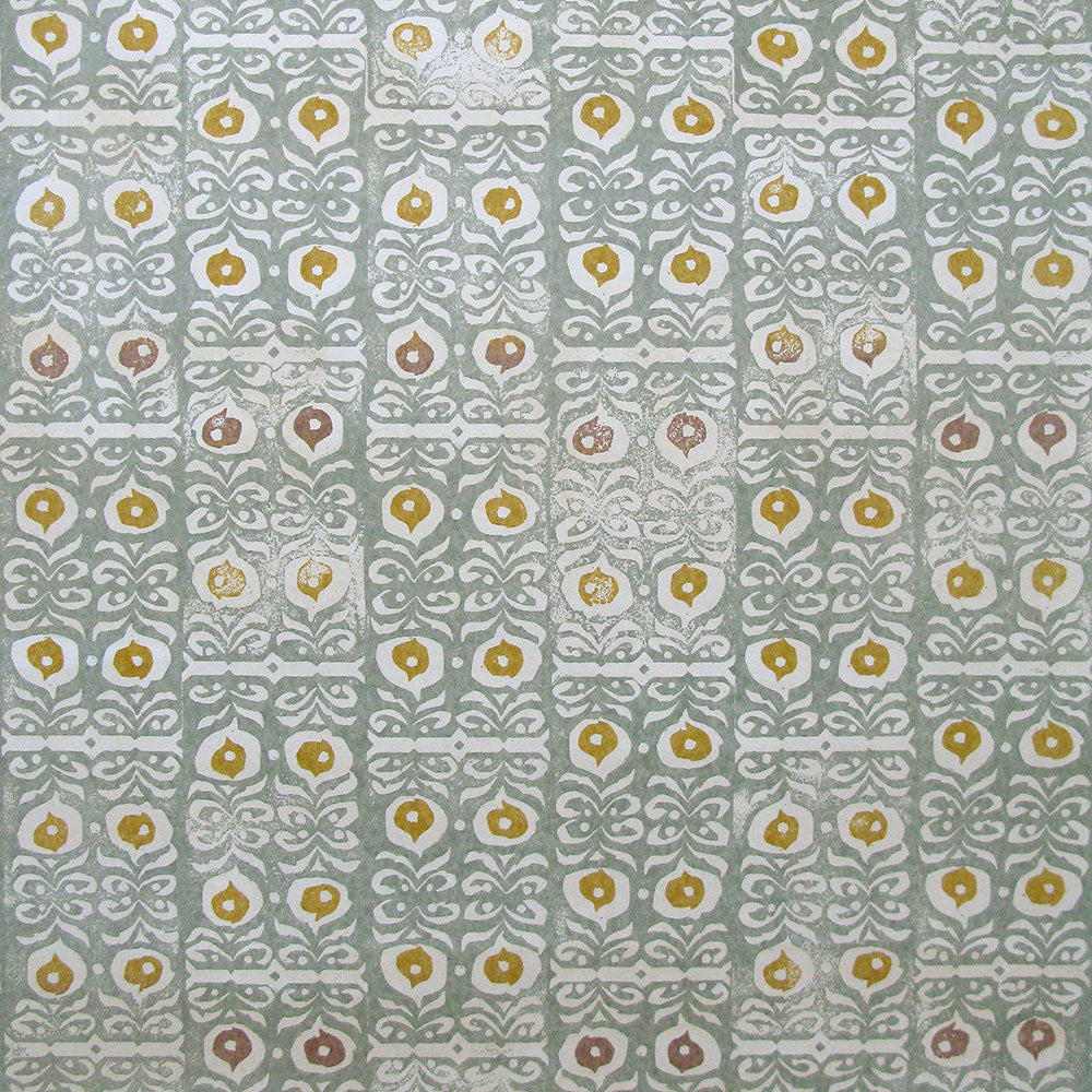 Wallpaper in a repeating damask print in mustard and white on a blue-gray field.