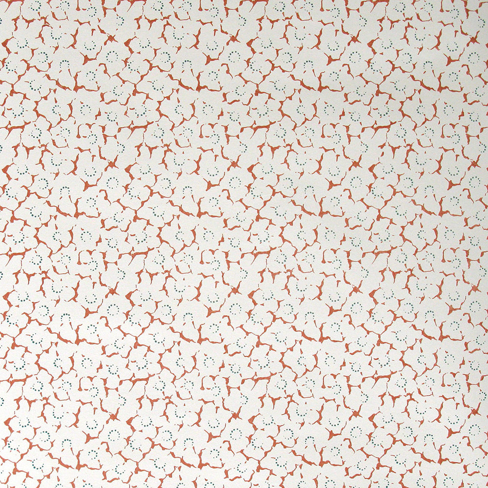 Wallpaper in a minimal floral print in blue and rust on a cream field.