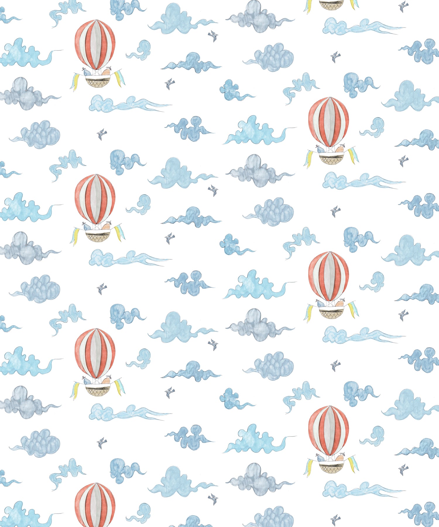 Pattern of hot air balloons and clouds on a white background