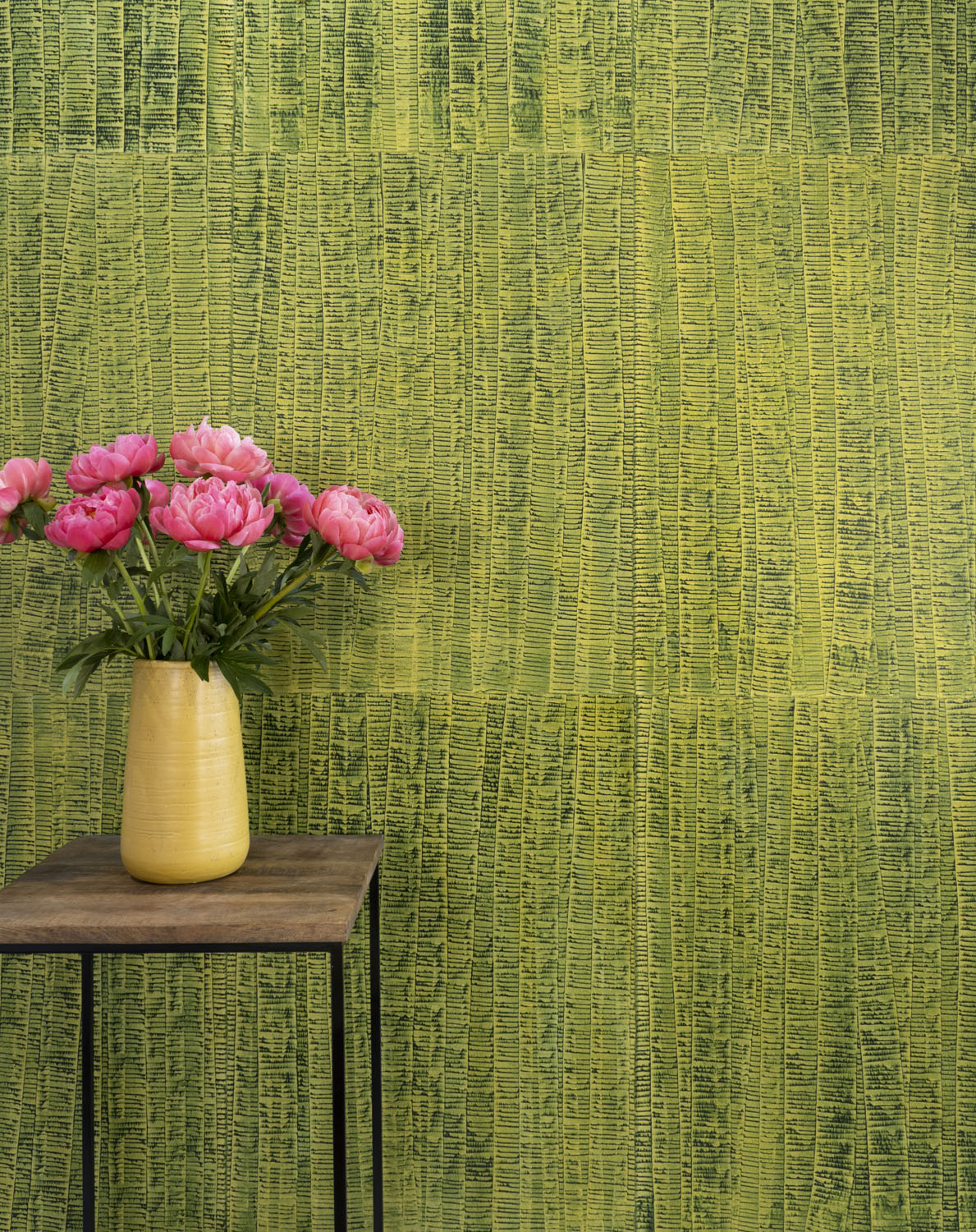 A vase of flowers stands in front of a wall papered in an undulating ribbon pattern in green on a gold field.