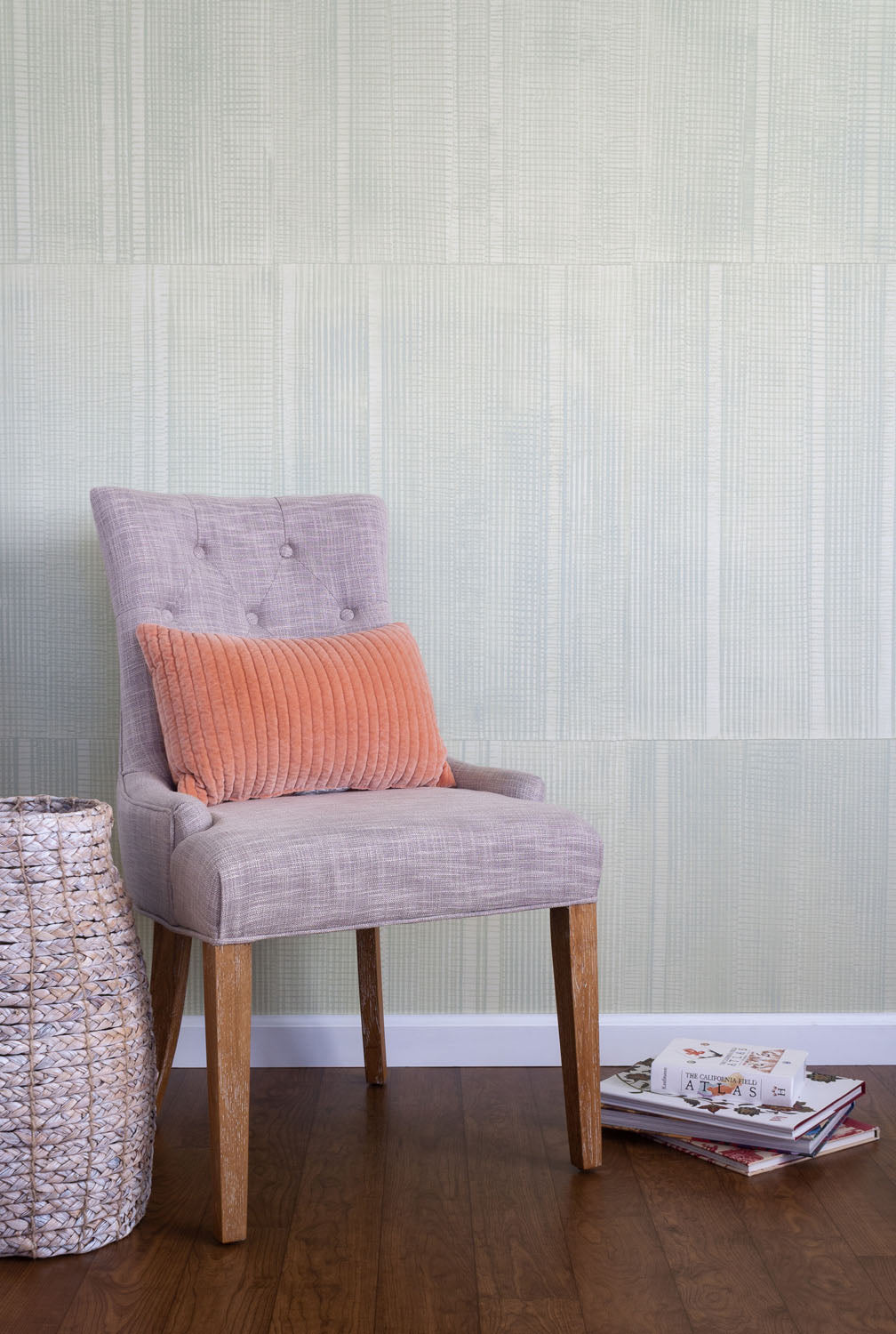 A chair and some books stand in front of a wall papered in an irregular grid pattern in light gray on a cream field.