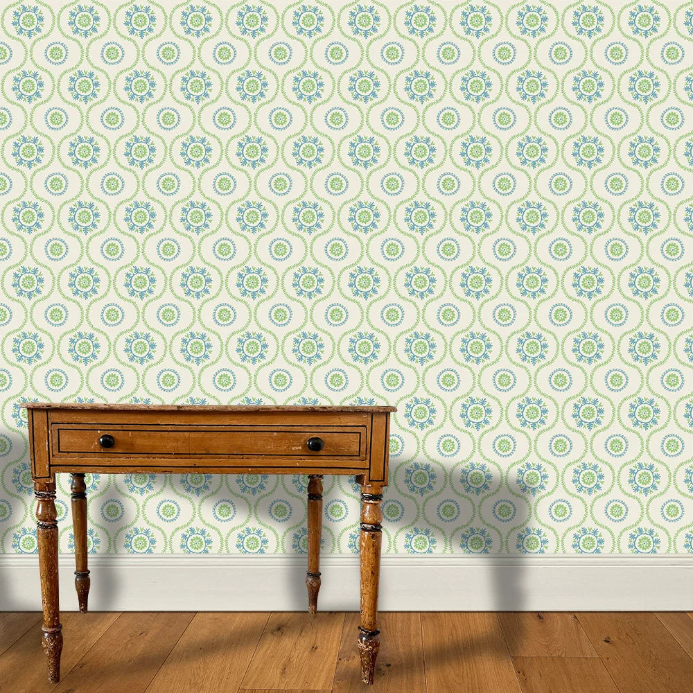 Detail of wallpaper in a playful floral stripe in blue and green on a light blue field.