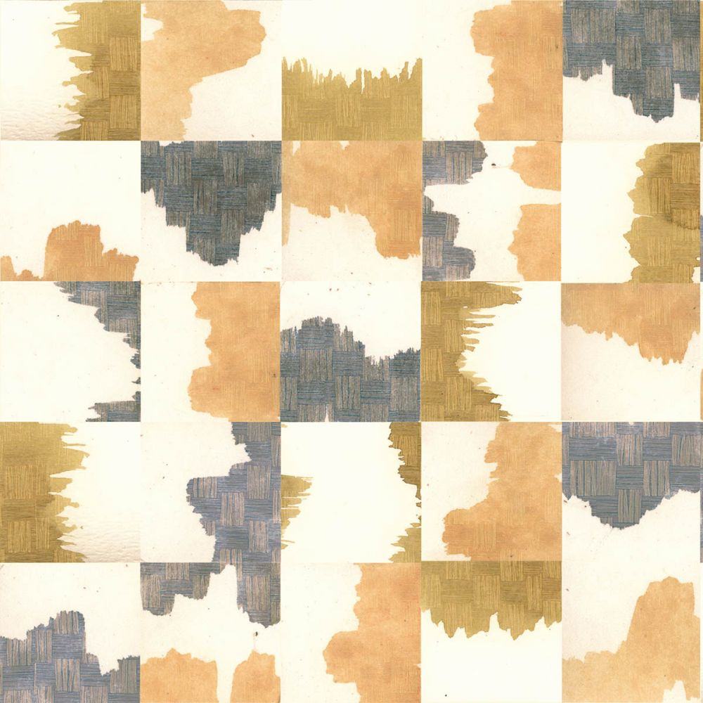 Detail of wallpaper in an abstract block print in shades of tan and gray on a cream field.