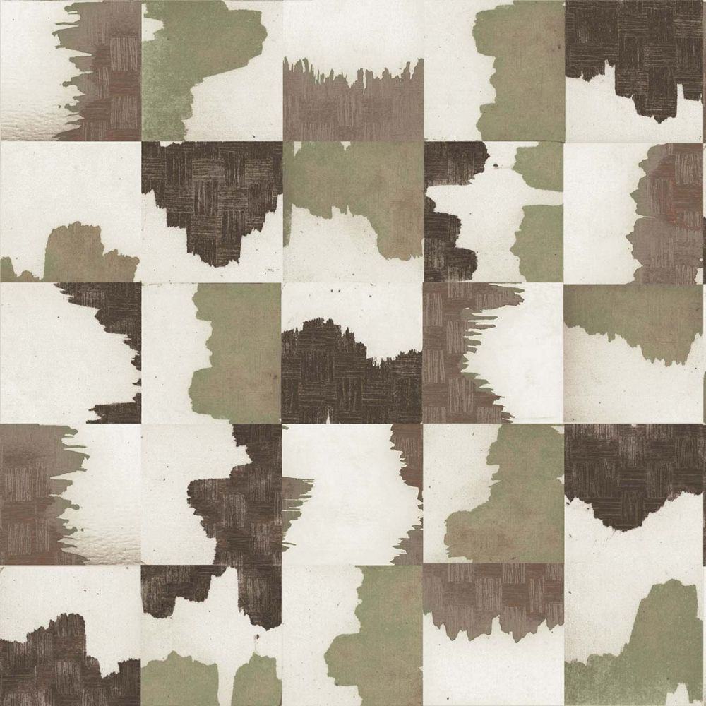 Detail of wallpaper in an abstract block print in shades of green and brown on a cream field.