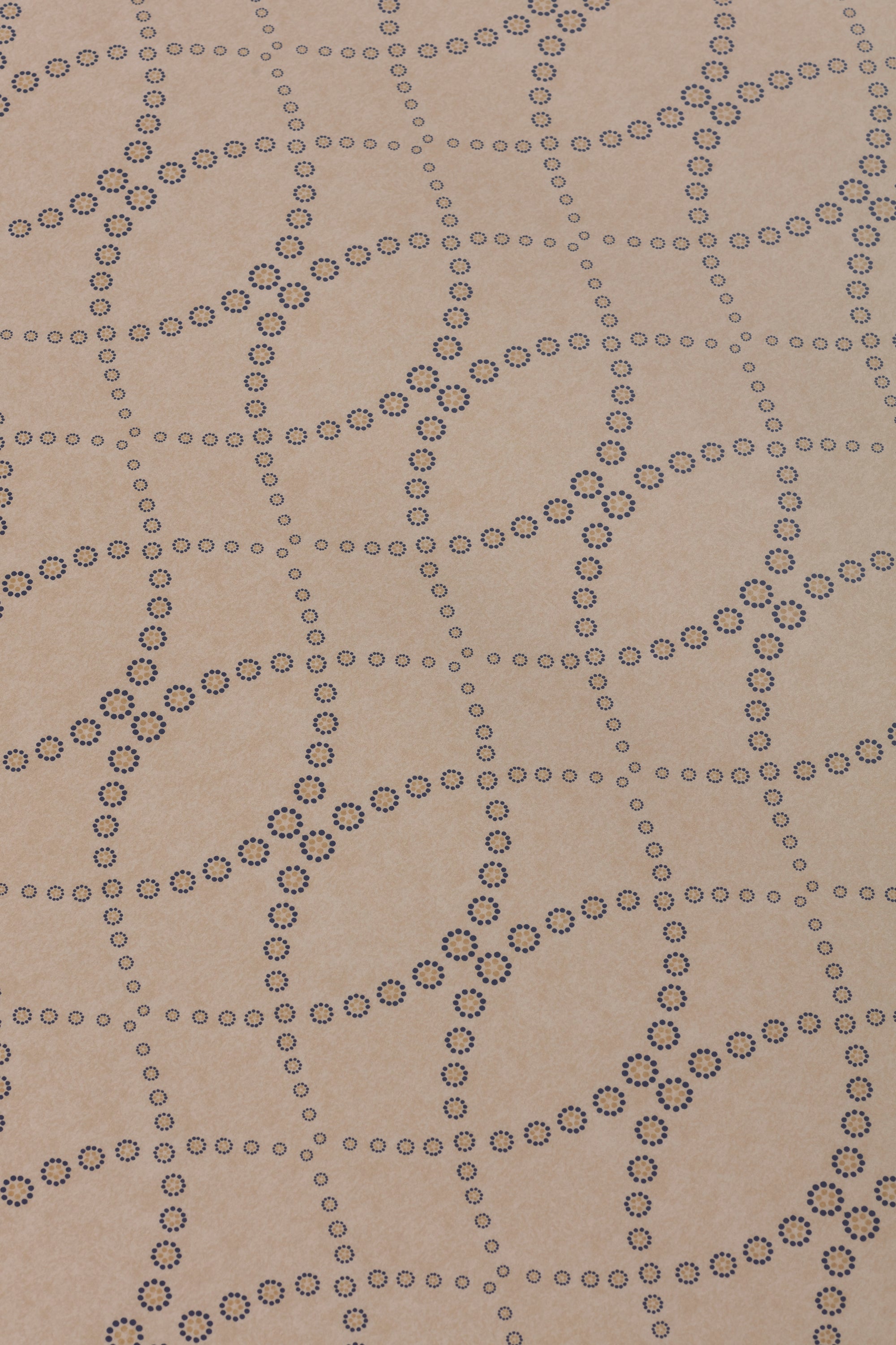 Detail of a wallpaper in a playful floral lattice print in tan and navy on a taupe field.
