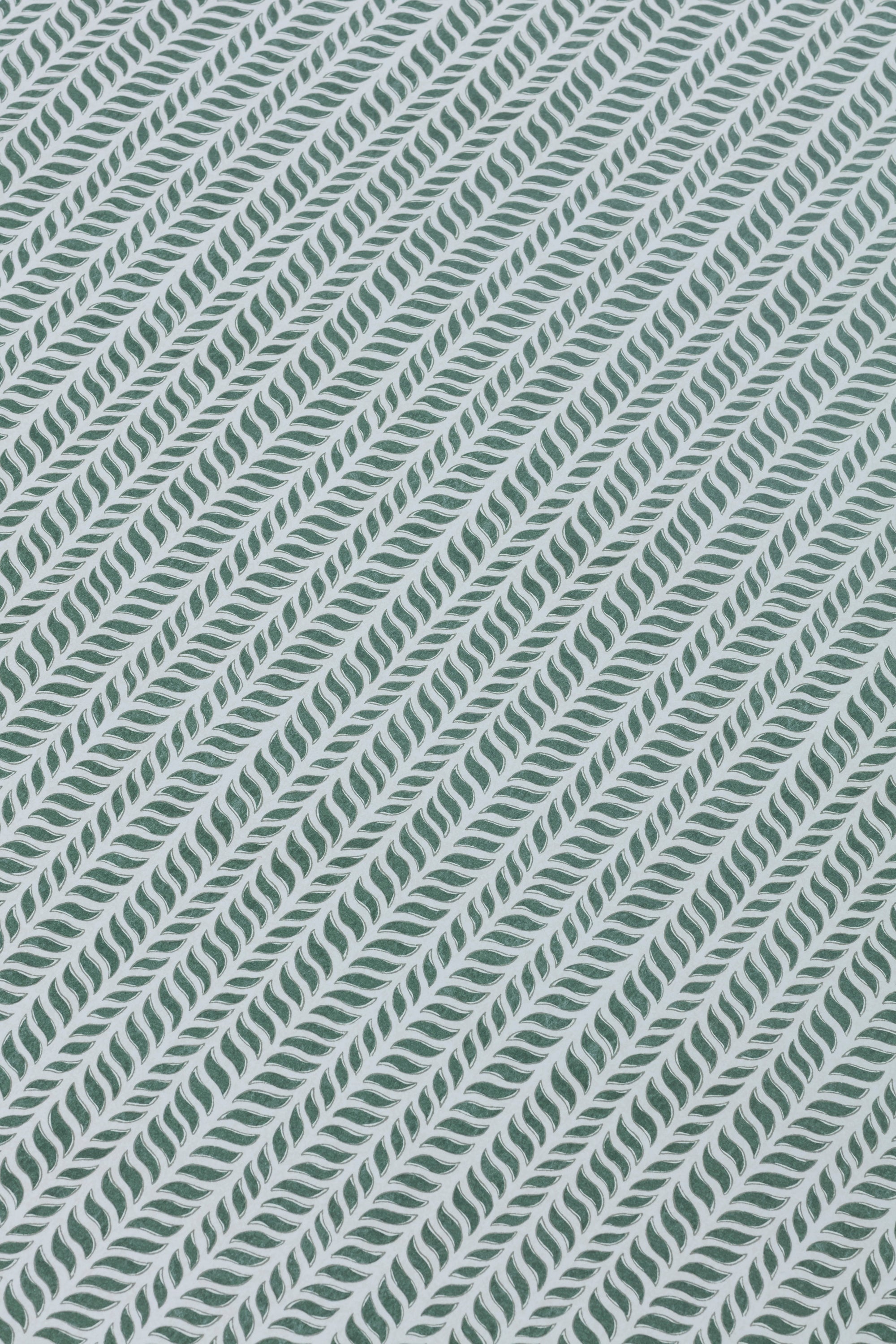 Detail of a wallpaper panel in a painterly herringbone print in olive on a light blue field.