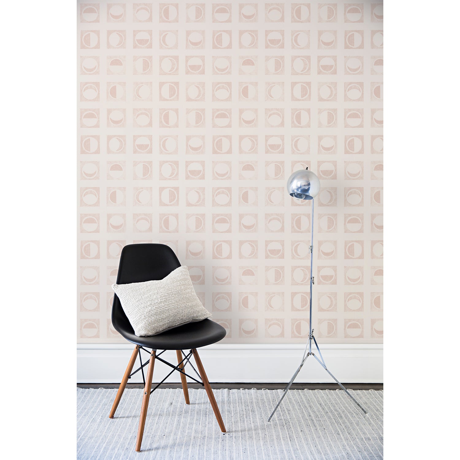 A chair and floor lamp in front of a wall papered in rows of block-printed light pink moons in various phases on a tan background.