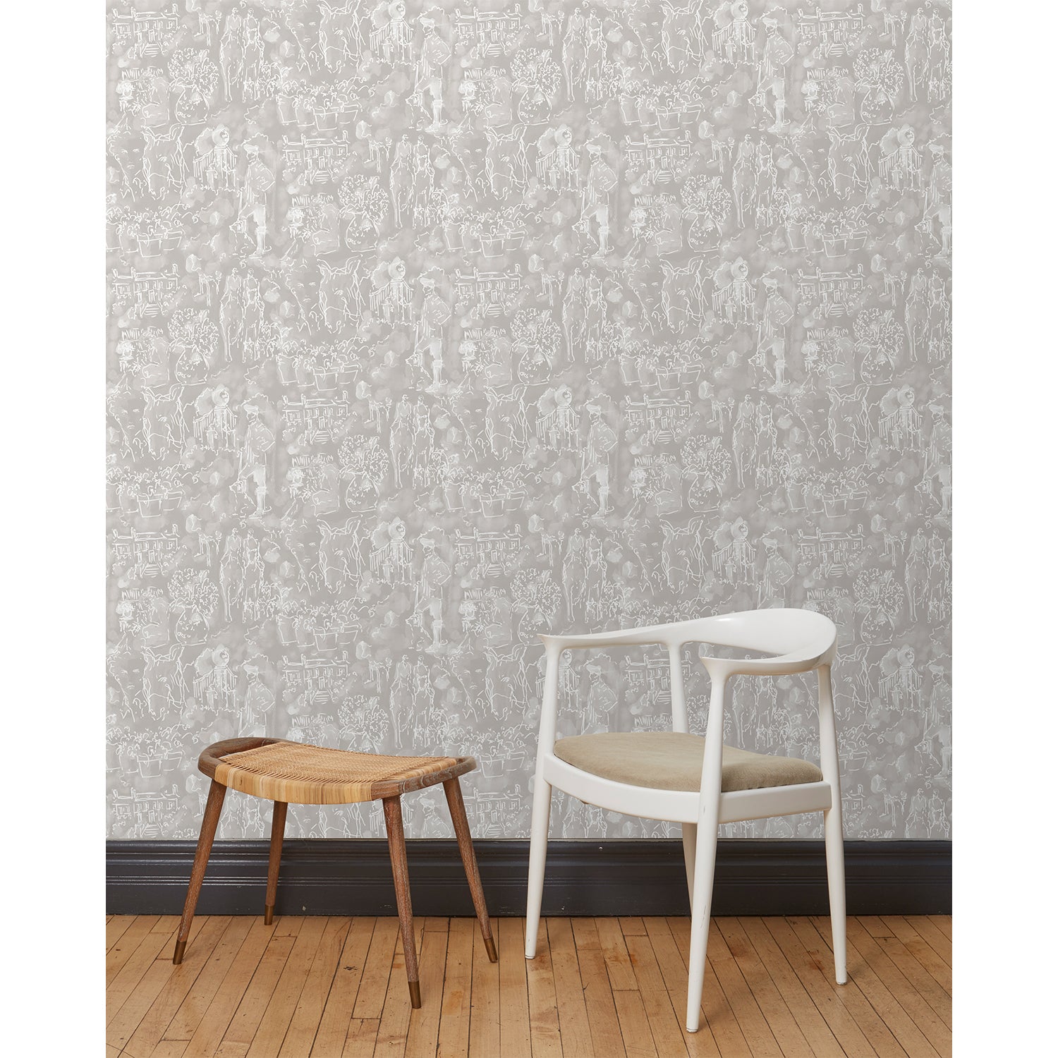 A chair and stool stand in front of a wall papered in repeating watercolor illustrations of horses, farmers and country houses in white on a tan background.