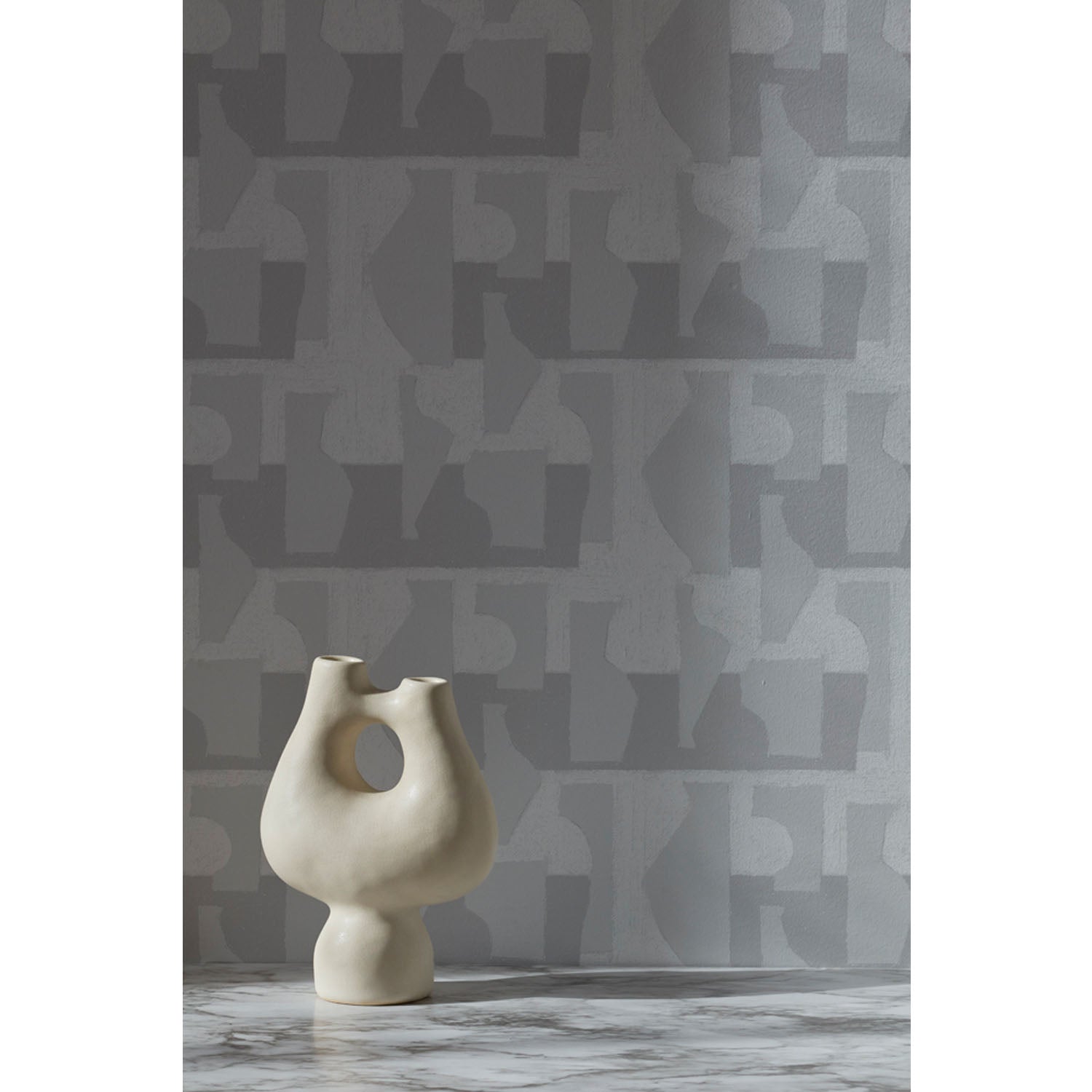 White vase in front of a wall with a pattern of pale grey geometric vessel shapes over a white background with soft grey horizontal stripes.