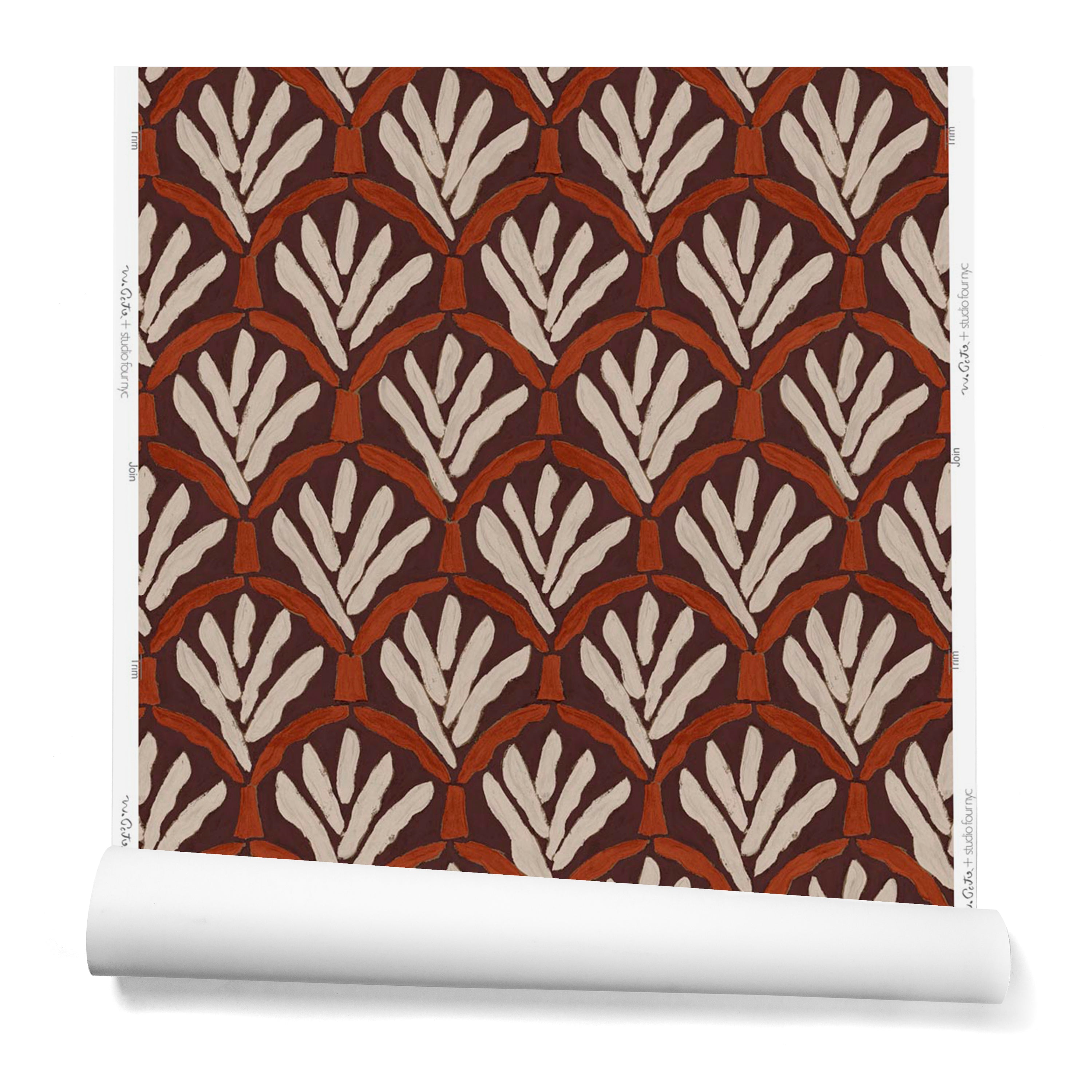 A hanging roll of wallpaper with a repeating Moroccan-inspired scallop pattern in white and red on a maroon background.