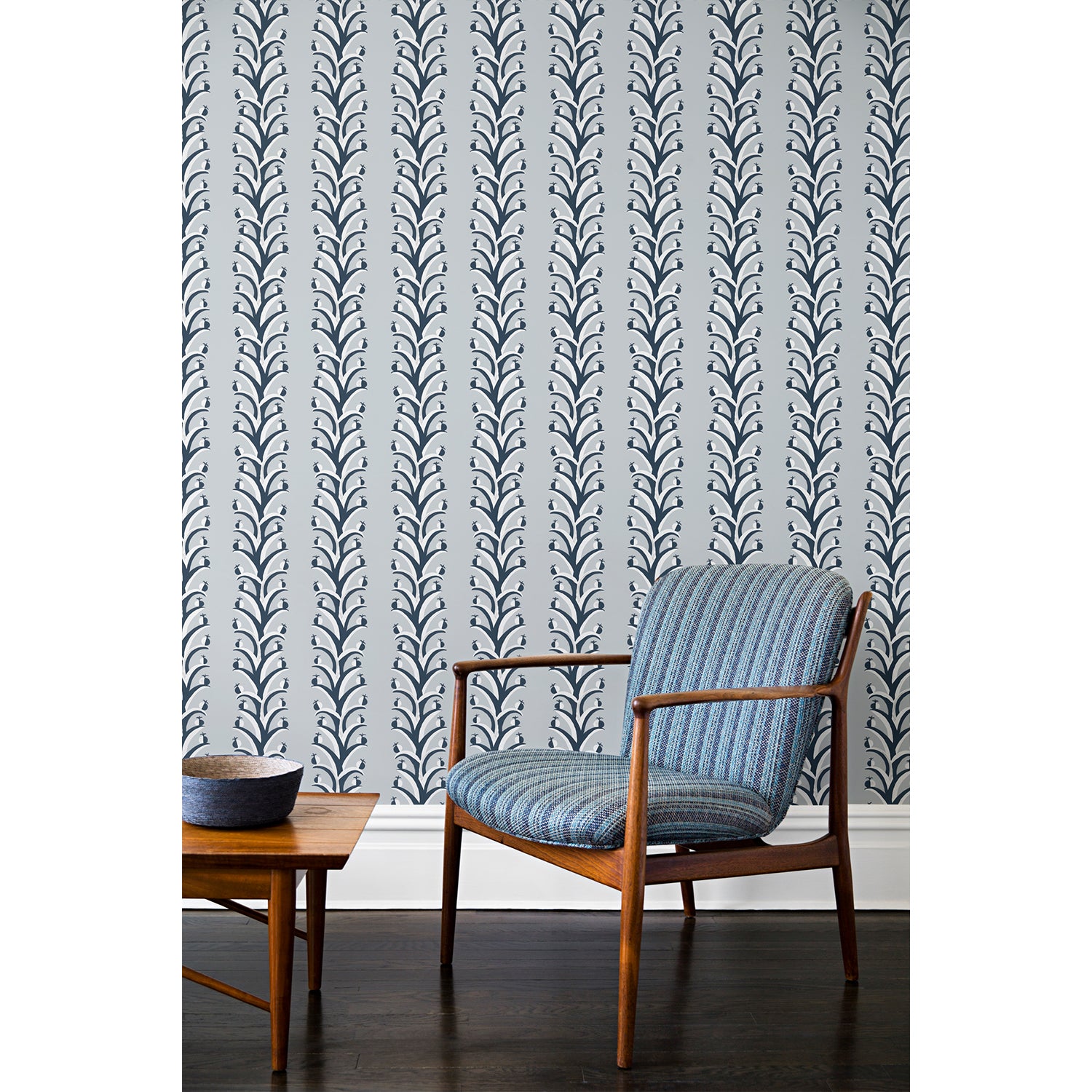An armchair and coffee table in front of a wall papered in repeating horizontal stripes of white and charcoal branches and fruit on a light gray background.
