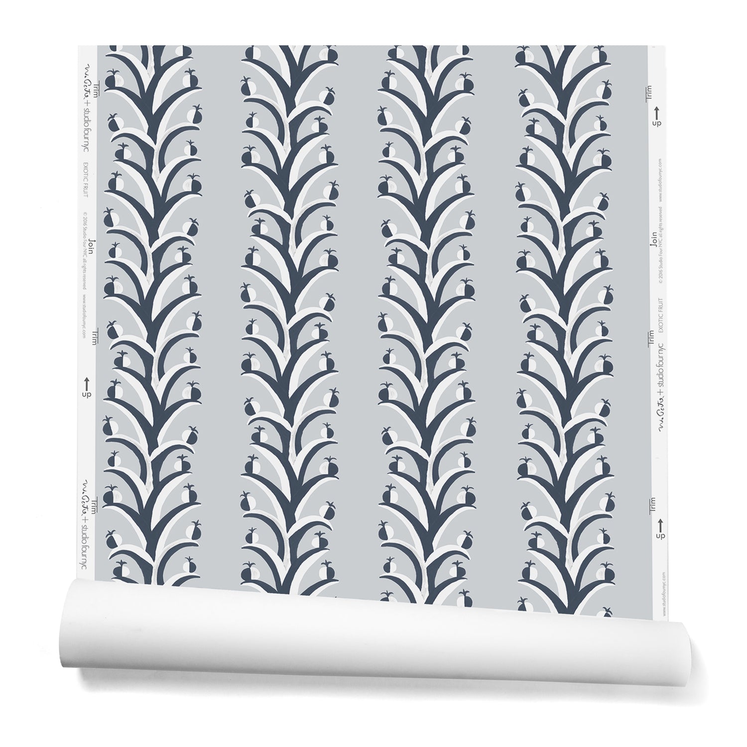 A hanging roll of wallpaper with repeating horizontal stripes of white and charcoal branches and fruit. Background is light gray.