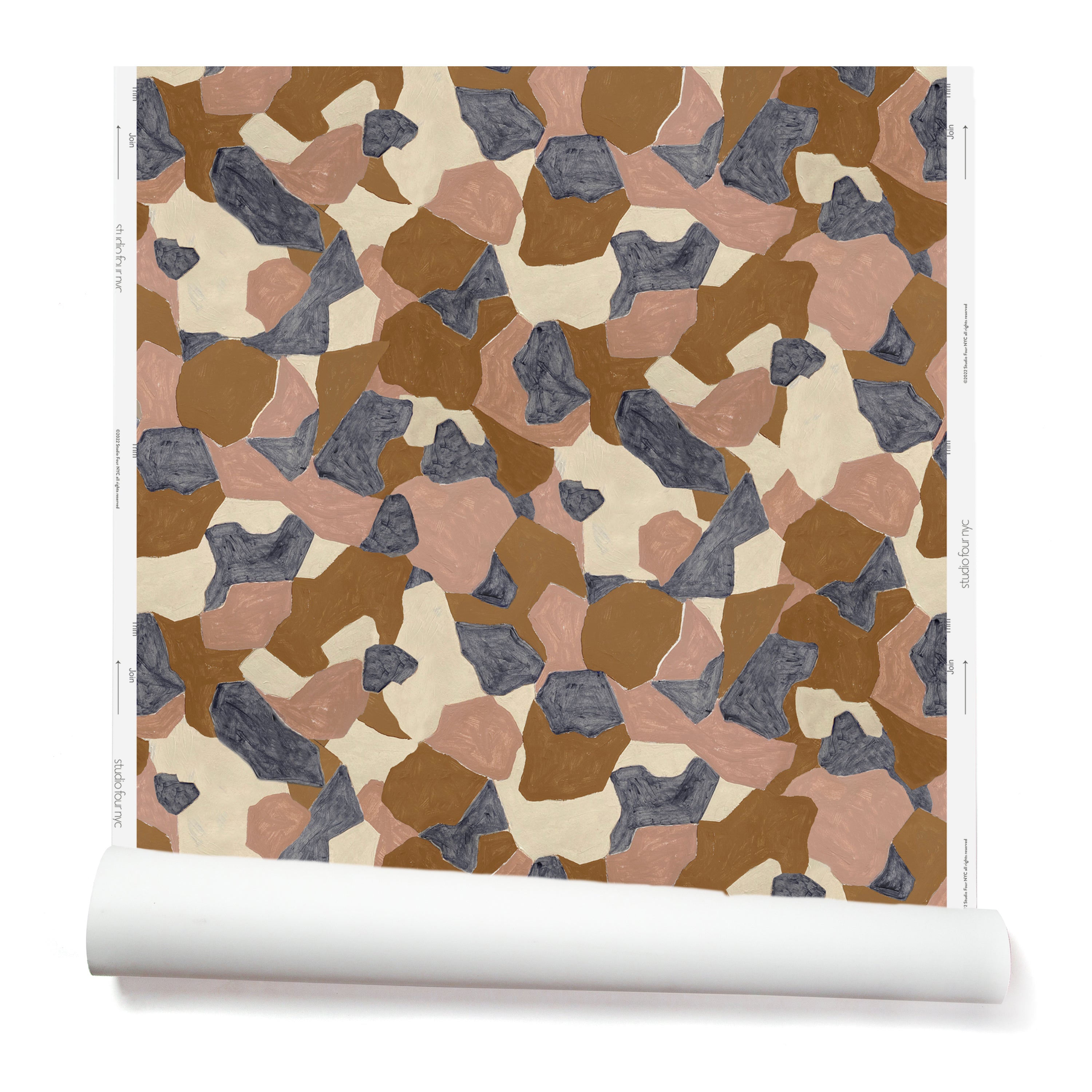 Partially unrolled wallpaper in a painterly geometric pattern in shades of mauve, brown, cream and navy.