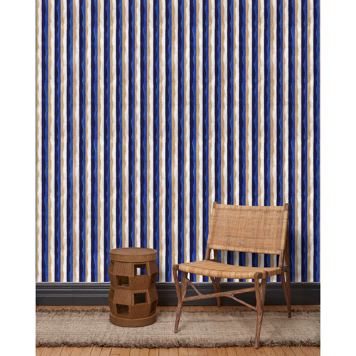 A wooden chair and end table in front of a wall papered in a curvy hand-painted stripe pattern in blue, gold, white and navy.