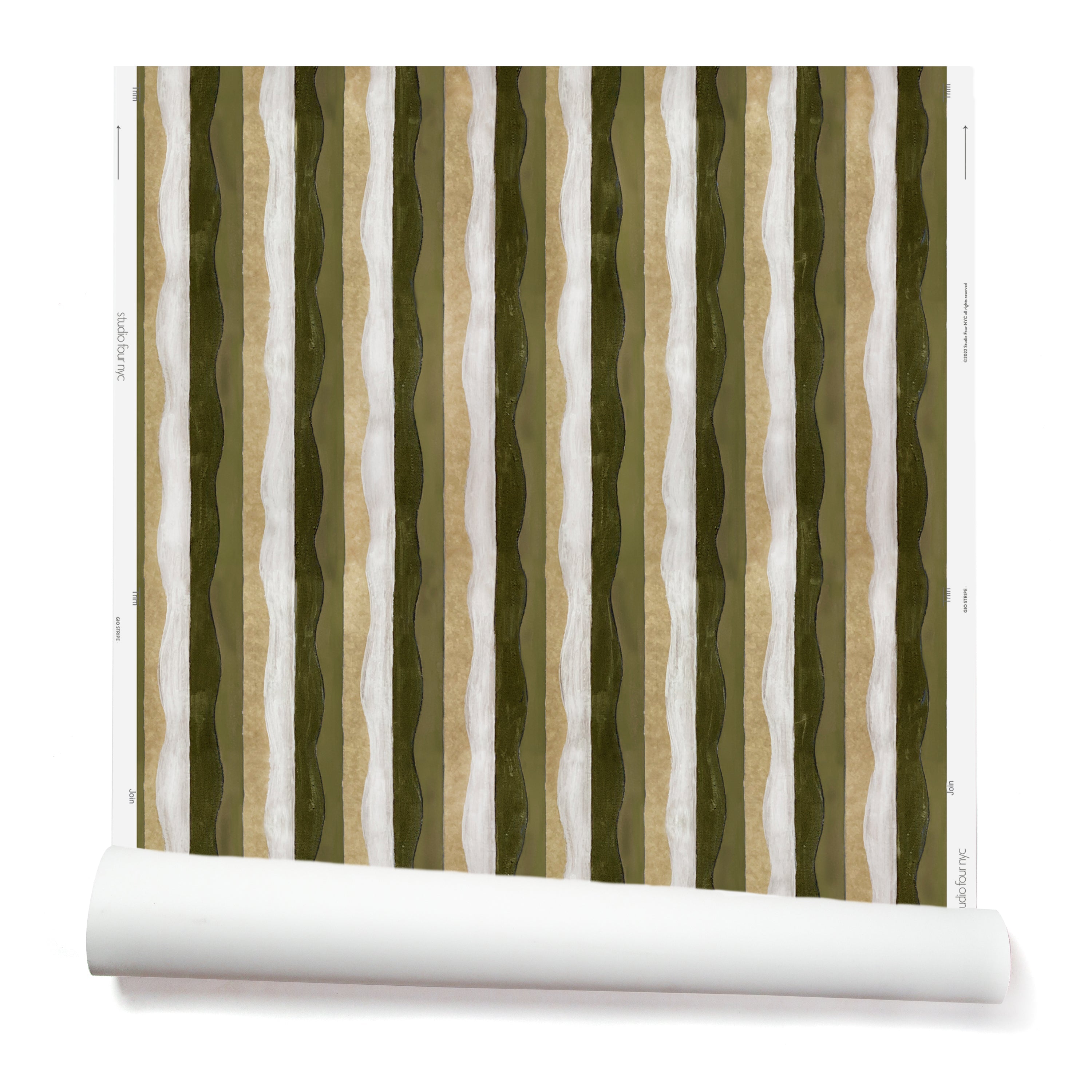 Partially unrolled wallpaper in a curvy hand-painted stripe pattern in olive, sage, white and gold.