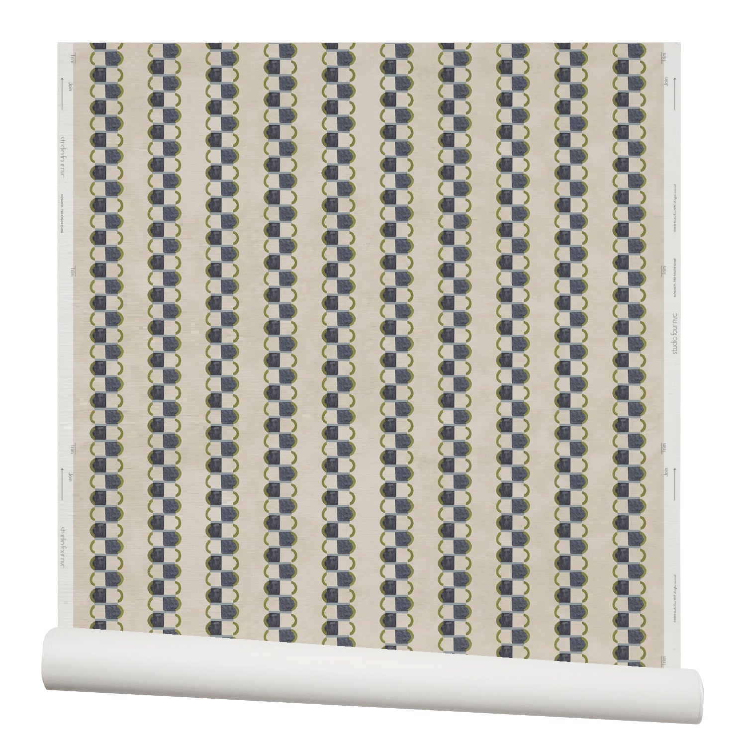 Partially unrolled wallpaper in a repeating mosaic stripe print in shades of green and gray-blue on a tan field.