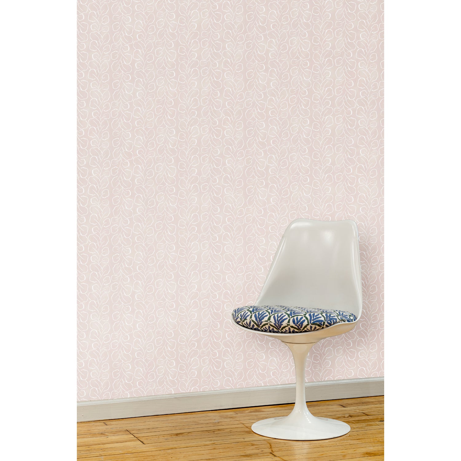 A white swivel chair in front of a wall papered in a large-scale repeating leaf print in white on a light pink watercolor background.