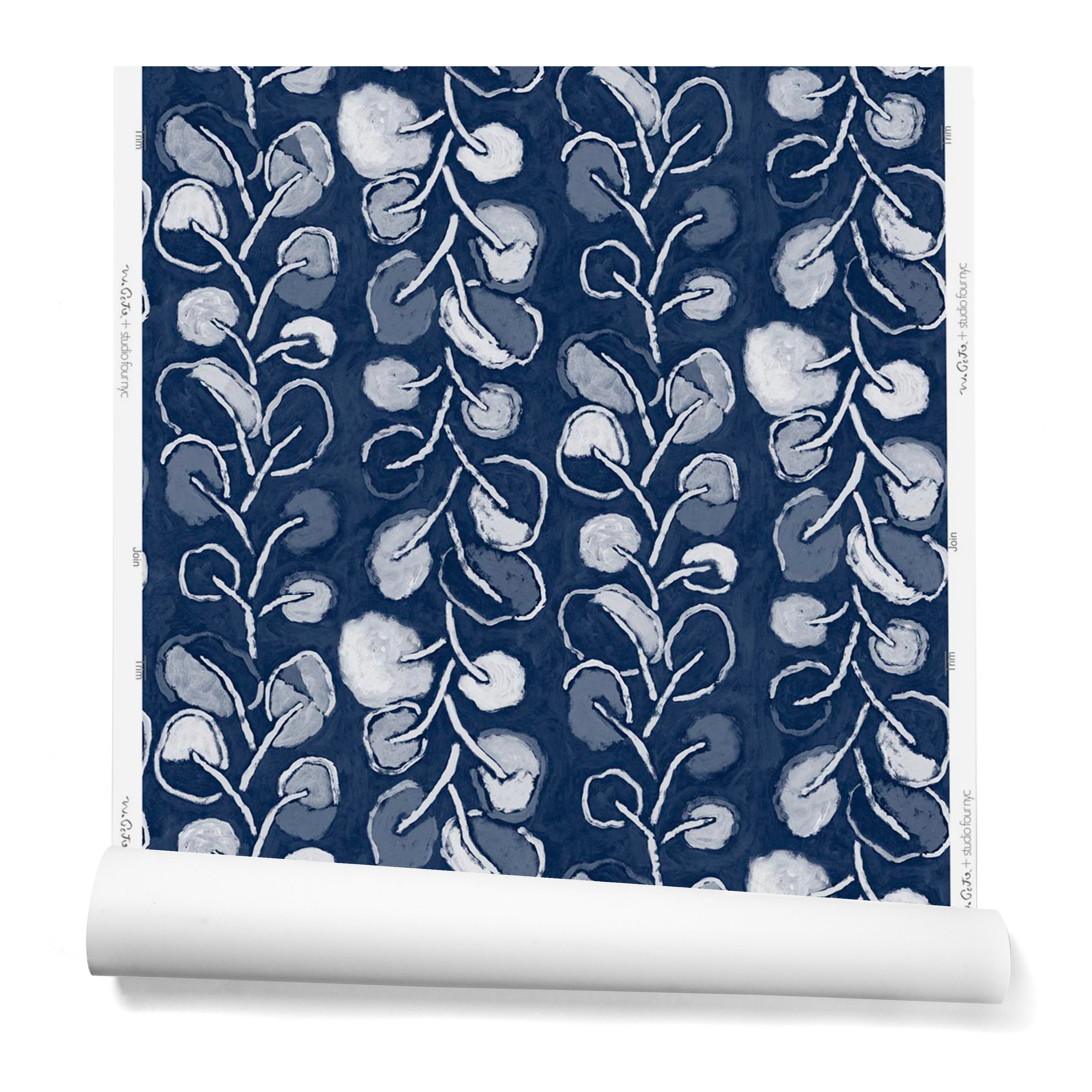 A hanging roll of wallpaper with repeating rows of colorful leaf prints in shades of blue and white on a navy background.